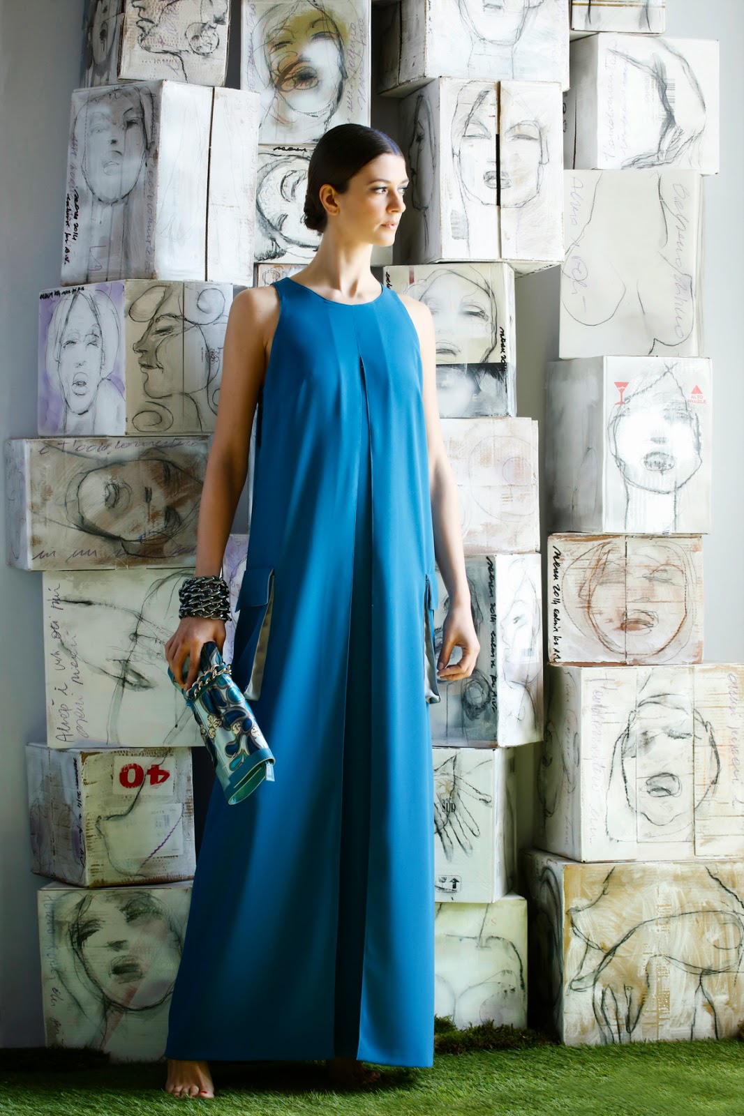 Le gonne sfiorano la caviglia per tutte le ore del giorno, i pantaloni sono maschili ed ampi, le tute iper presenti a incrocio o intarsi e le tuniche essenziali e minimal. Grande spazio al camoscio, seconda pelle morbida e avvolgente, accanto a tessuti in mikado, twill, faille e crepe di seta stampata, tra velette che diventano pizzi, chiffon, pailettes e maglina di seta spalmata lurex.