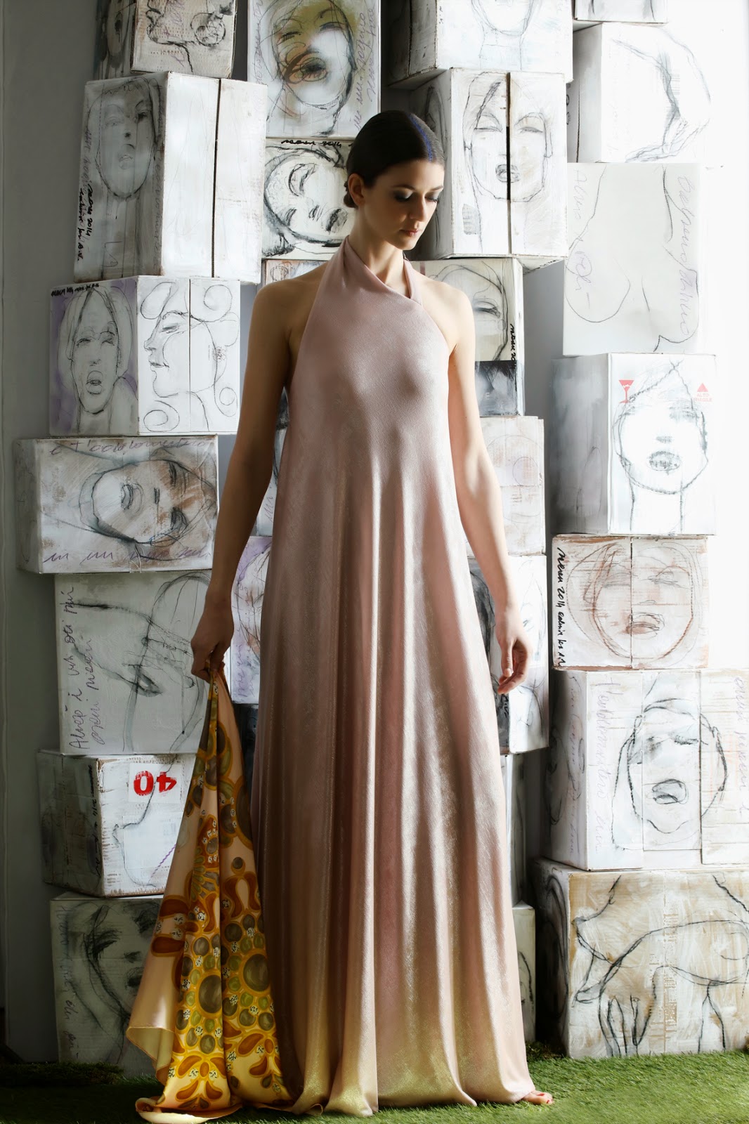 Sette mood, sette atmosfere in continua evoluzione scandiscono una storia fatta di legami che diventano catene, rappresentati da fasce e geometrie che gradualmente lasciano spazio ad un corpo-anima, semplice e lineare, che traspare da tuniche minimal chic. Poi l’abito diventa scultura, si modella sulla silhouette in un contrapporsi di rimandi e allusioni attraverso drappeggi e scollature a incrocio, abbracci avvolgenti e schiene scoperte fino al mood successivo, nel quale la donna da grande madre diventa androgina e ironizza con dress code maschili, indossa giacche da smoking su nude look e cravatte inserite in bluse di seta.