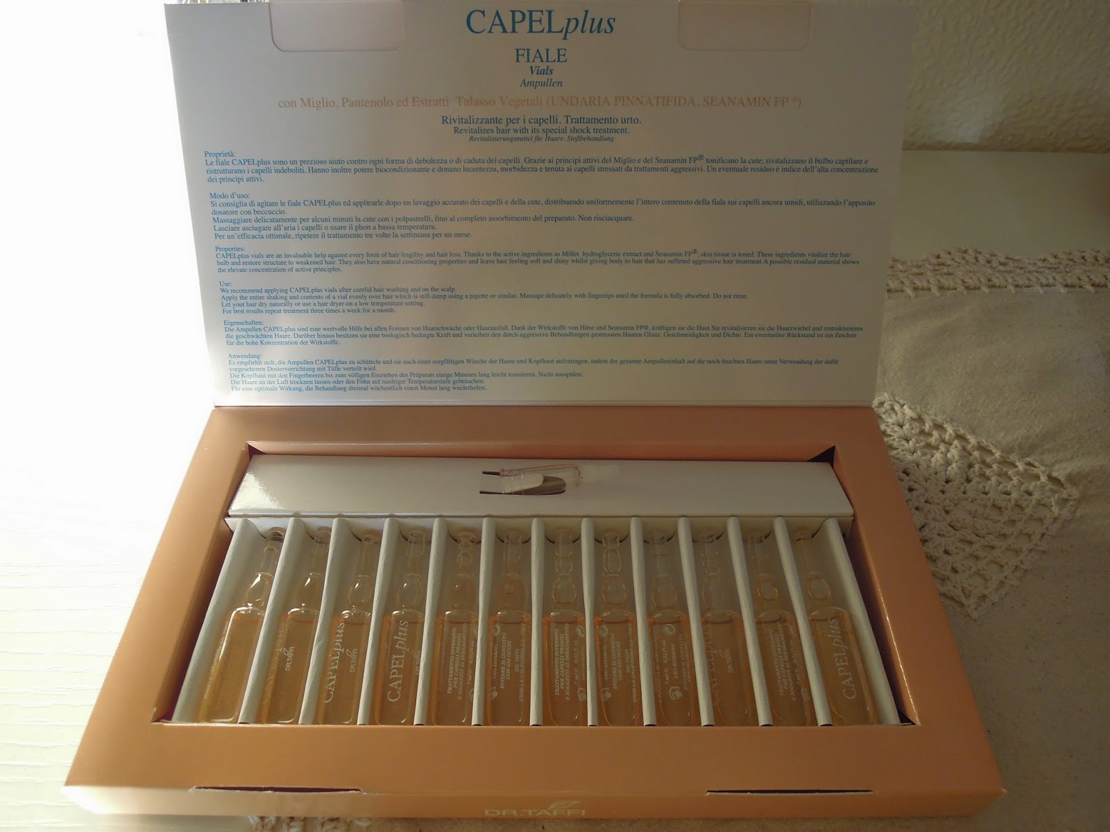 Ho poi acquistato la confezione di 12 fiale della linea Capel Plus, che ho regalato a miamma, la quale si è trovata molto bene, trovando un riscontro positivo sul rafforzamento dei suoi capelli.