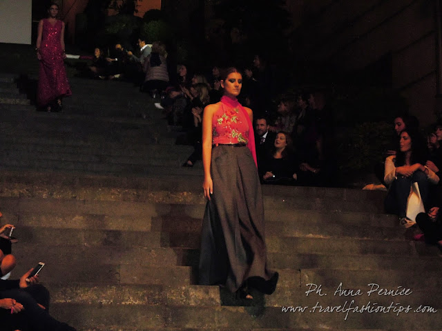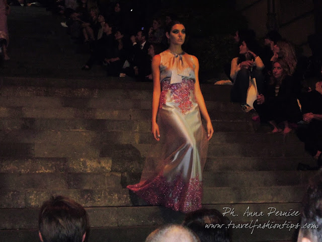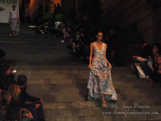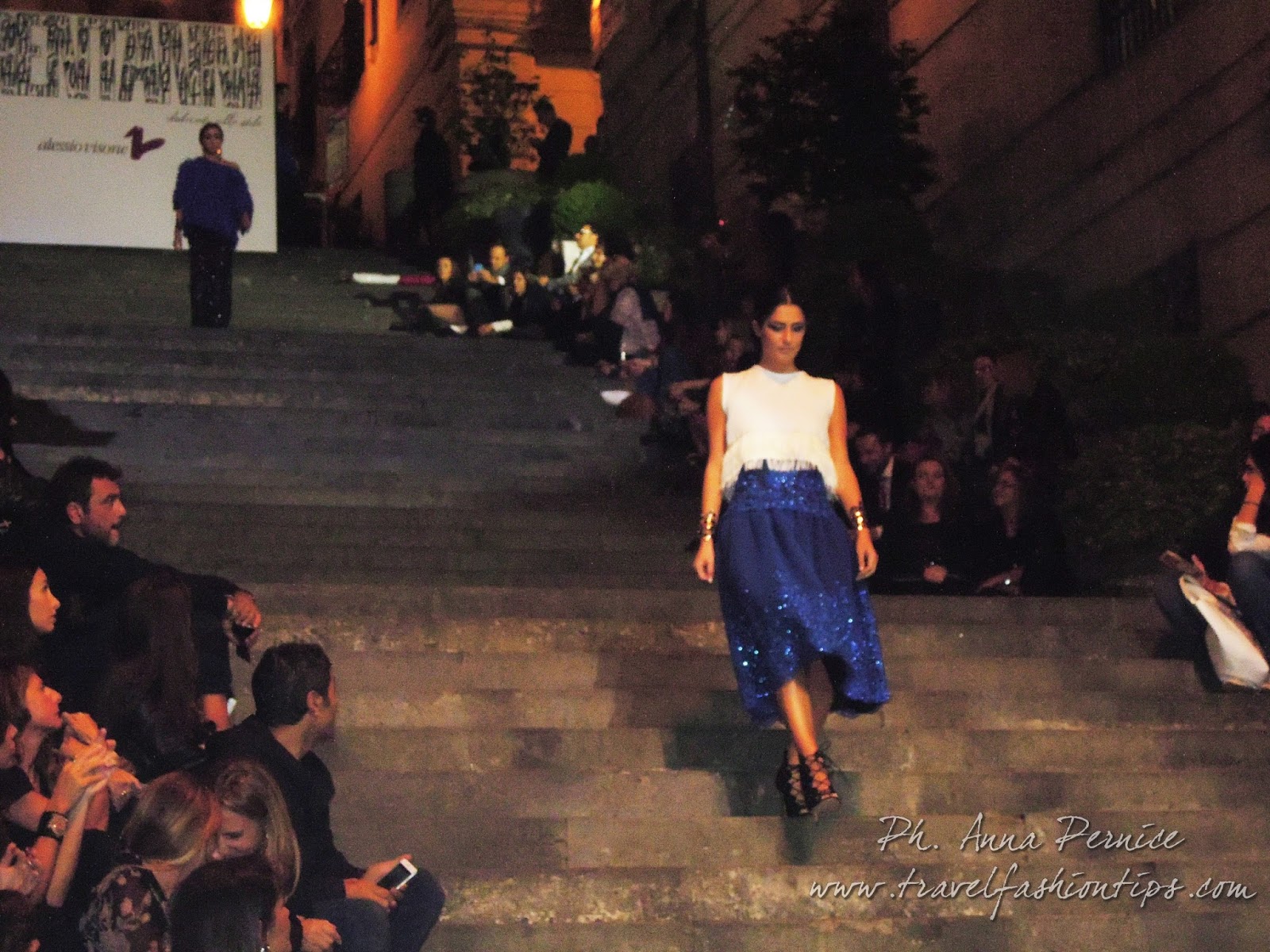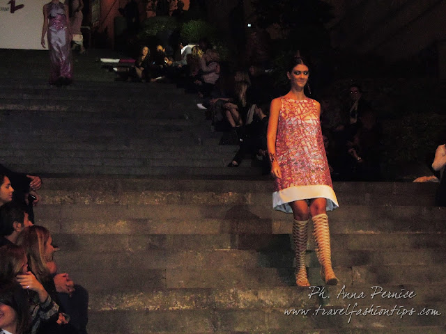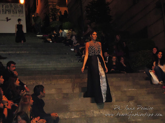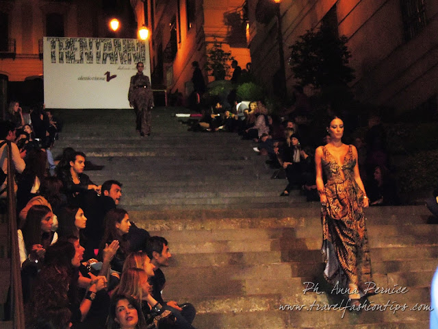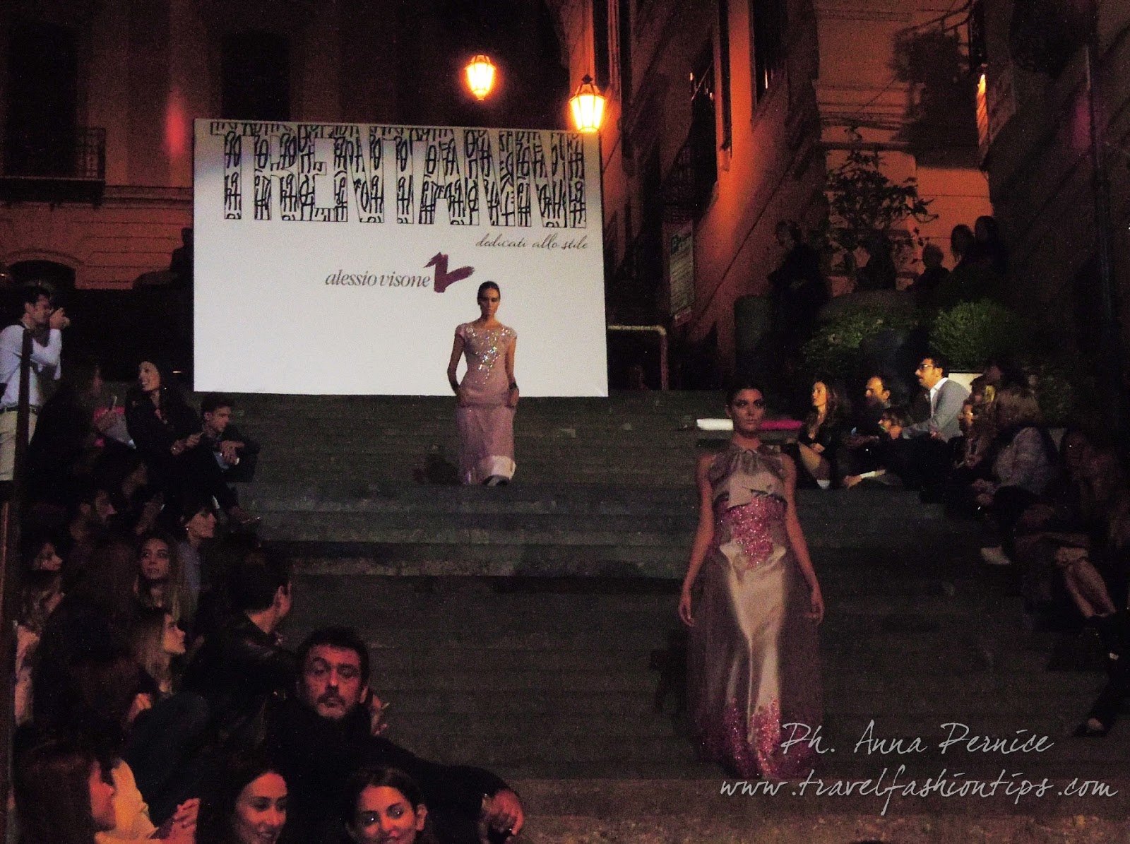 In cima alle scale, un backdrop con la scritta “Trent’anni”, stilizzata tra i disegni di Sergio Fermariello, il guerriero armato di scudo ed il condottiero a cavallo, riproposti anche nella nuova collezione di Alessio Visone, negli abiti in georgette e nei bracciali alla schiava.