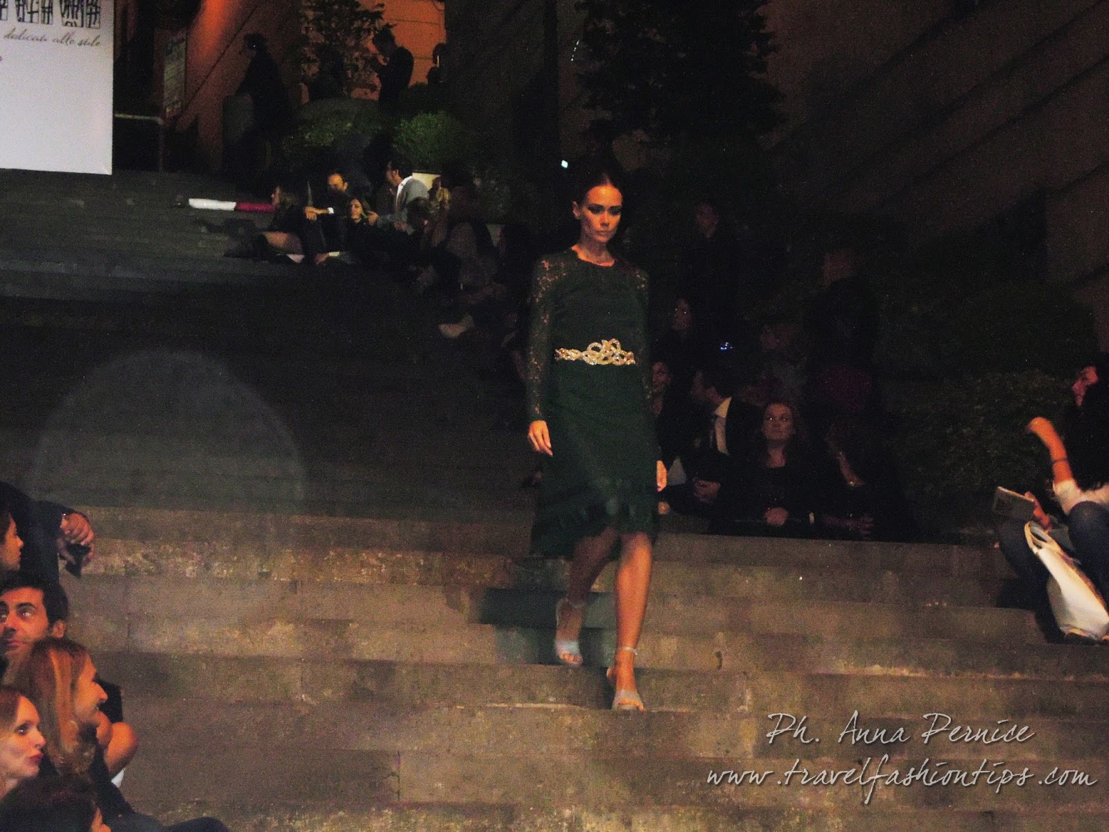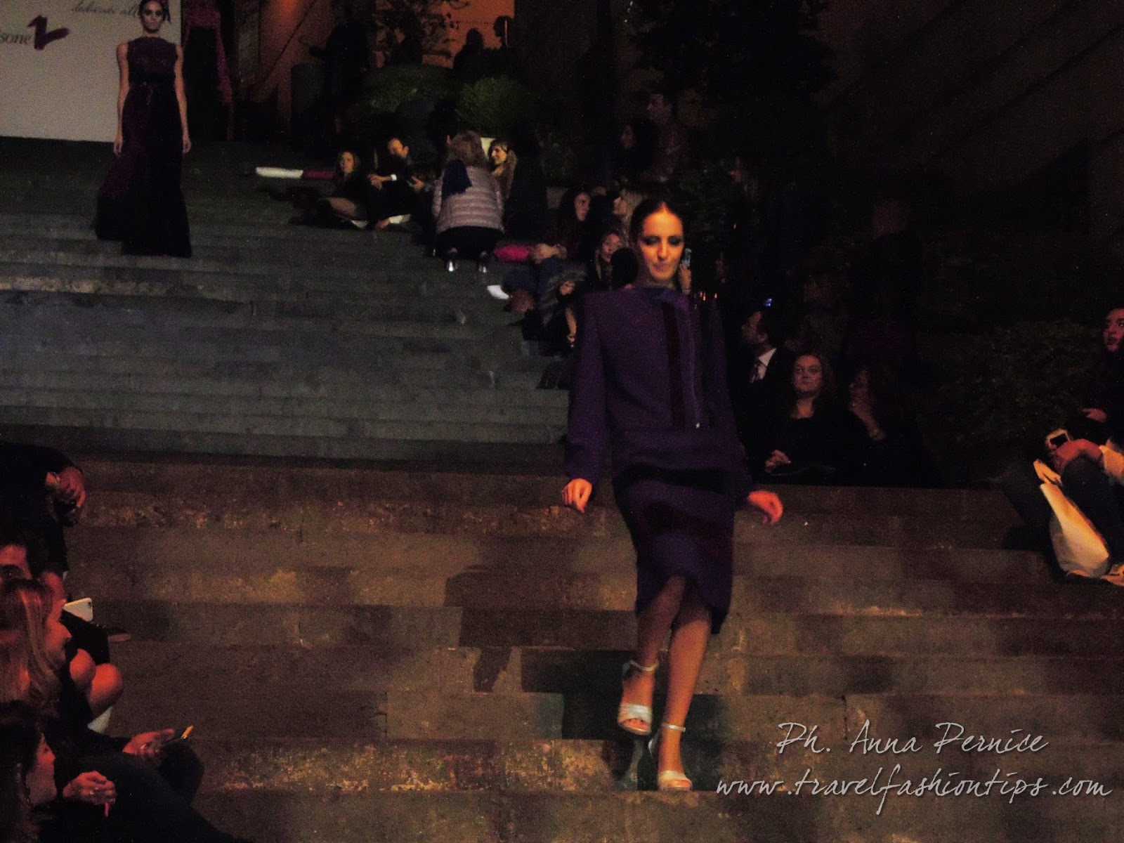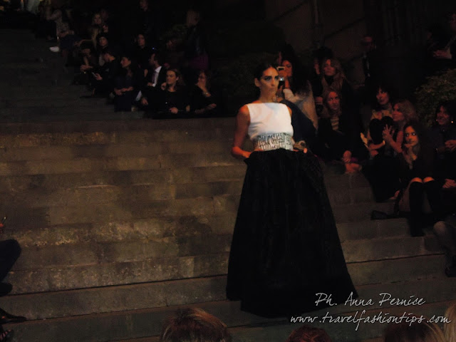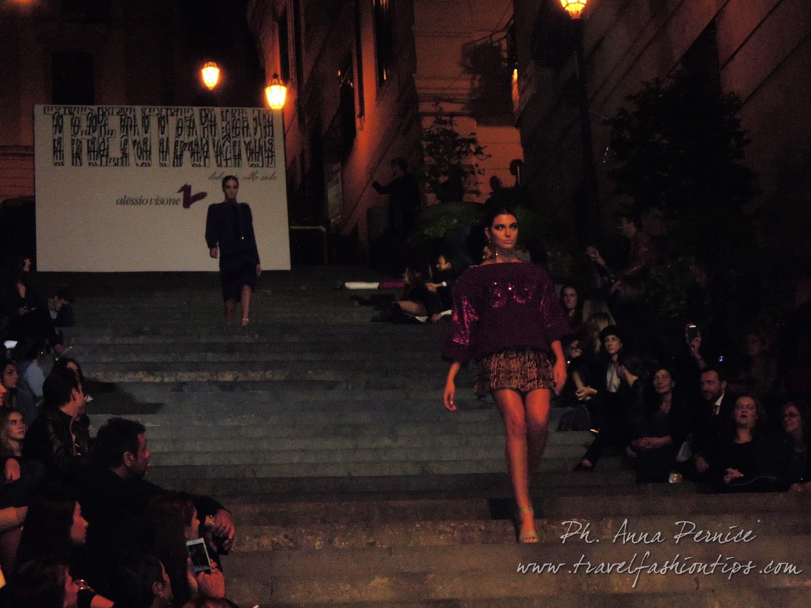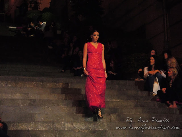 In cima alle scale, un backdrop con la scritta “Trent’anni”, stilizzata tra i disegni di Sergio Fermariello, il guerriero armato di scudo ed il condottiero a cavallo, riproposti anche nella nuova collezione di Alessio Visone, negli abiti in georgette e nei bracciali alla schiava.