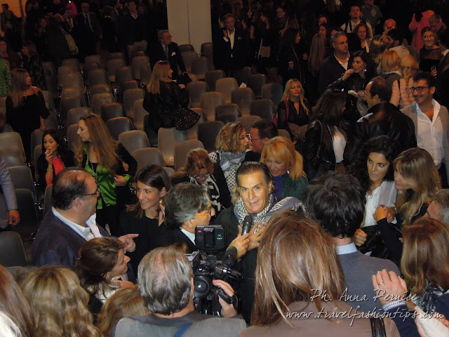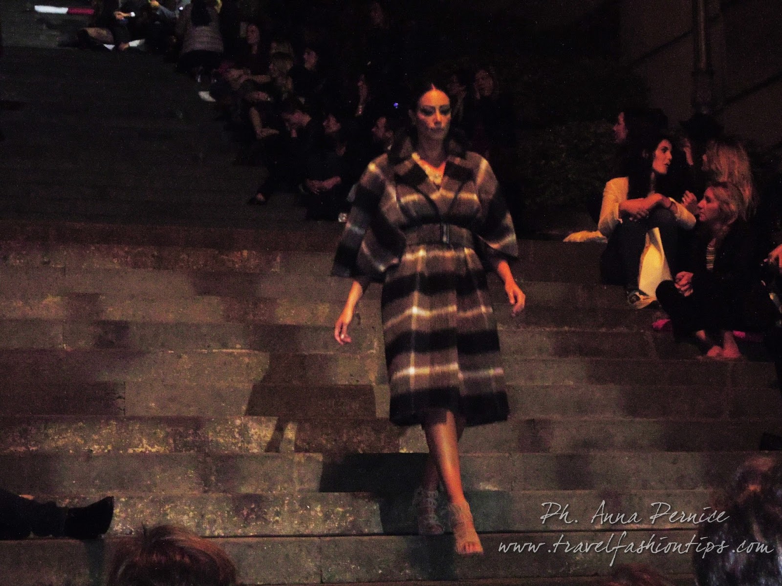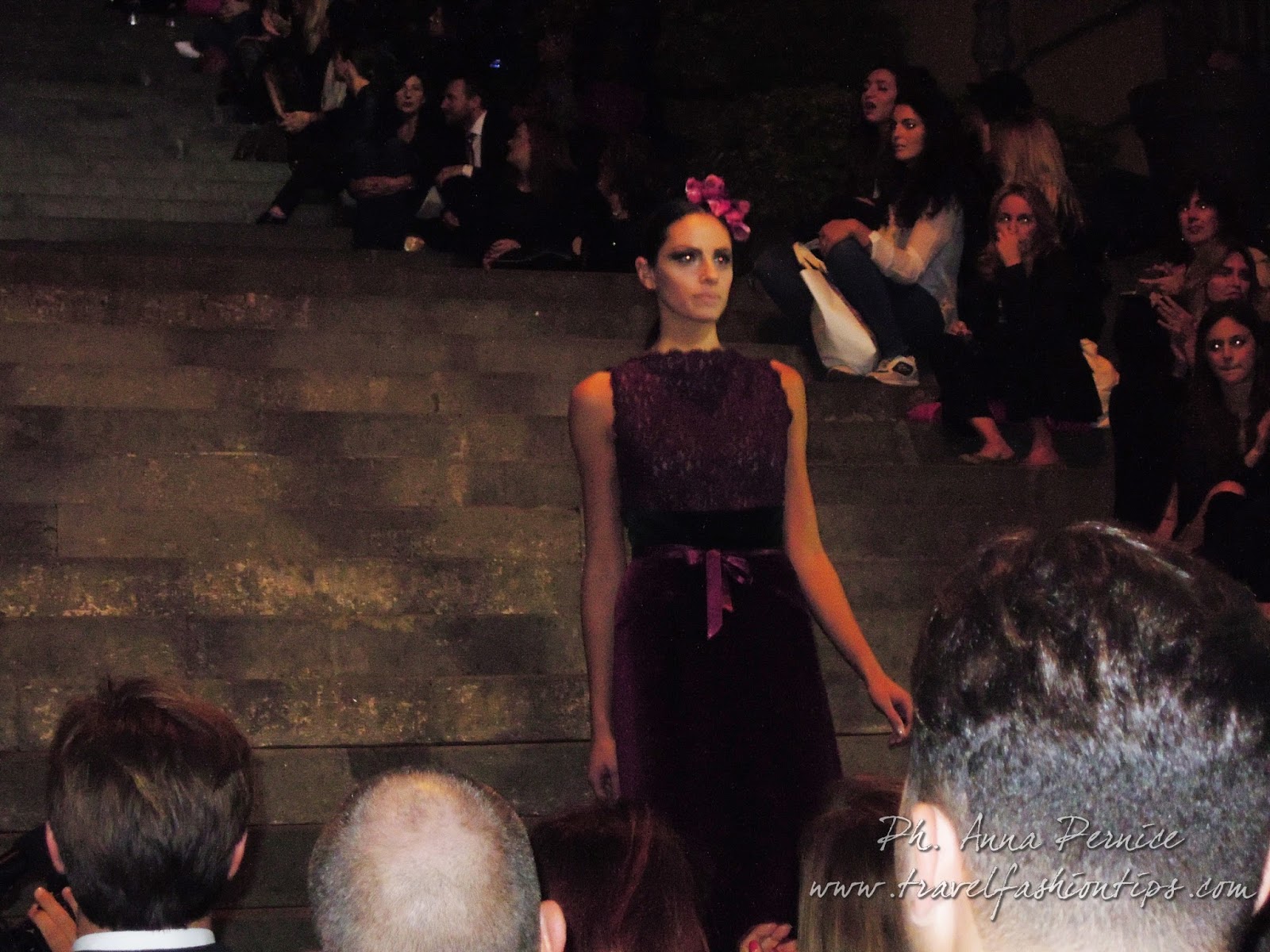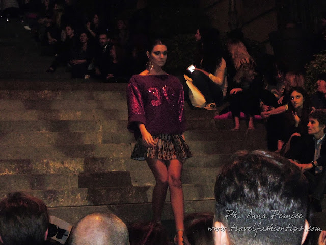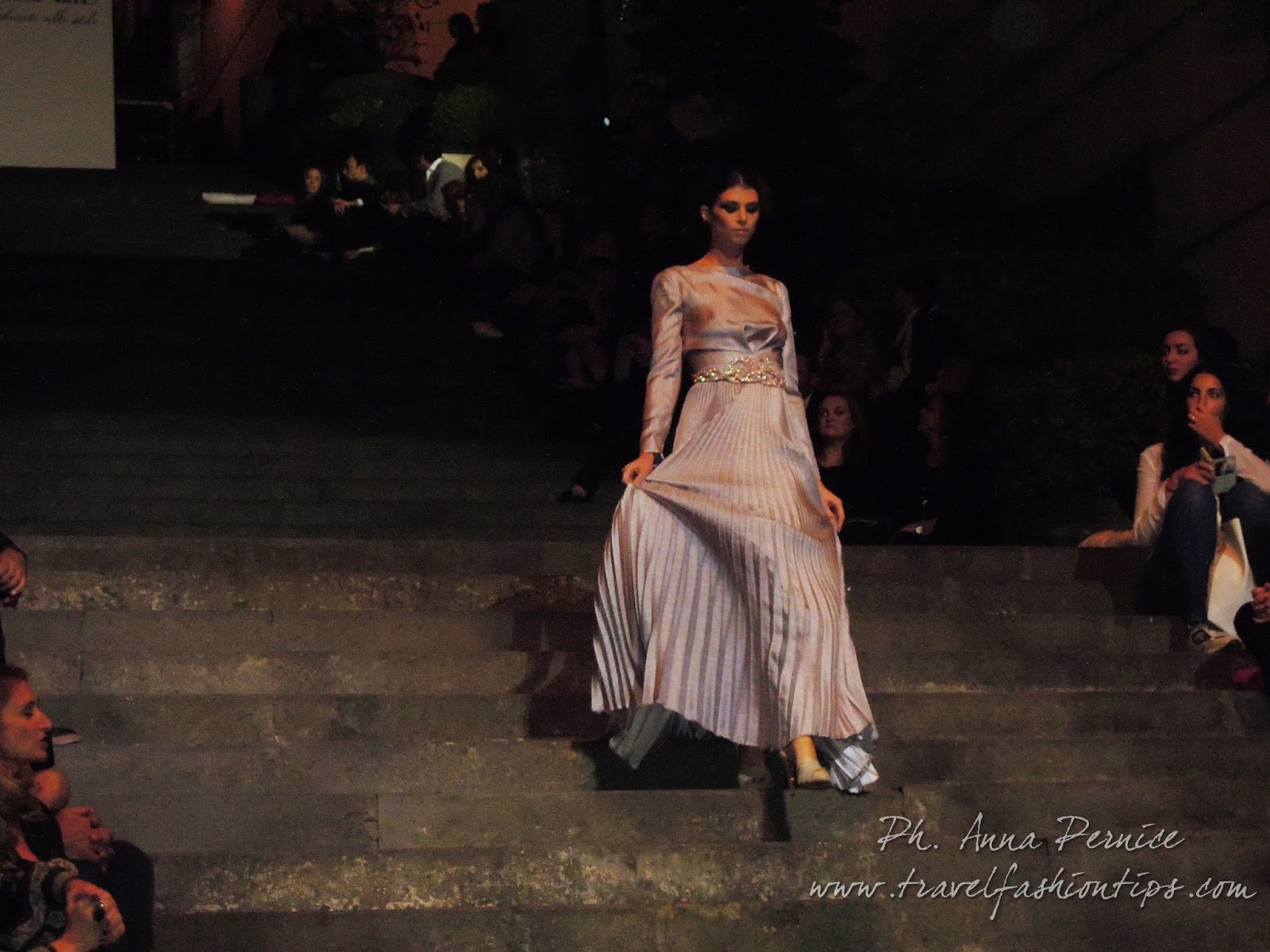 In cima alle scale, un backdrop con la scritta “Trent’anni”, stilizzata tra i disegni di Sergio Fermariello, il guerriero armato di scudo ed il condottiero a cavallo, riproposti anche nella nuova collezione di Alessio Visone, negli abiti in georgette e nei bracciali alla schiava.
