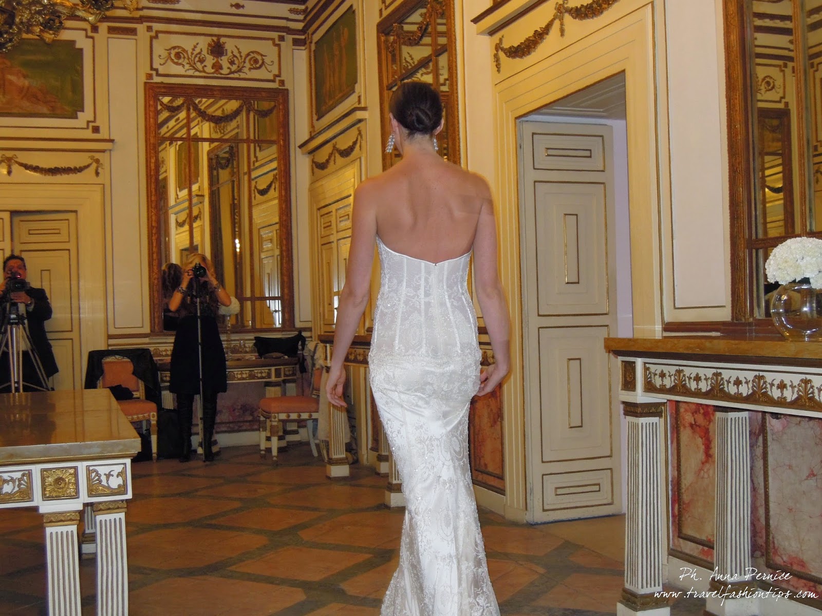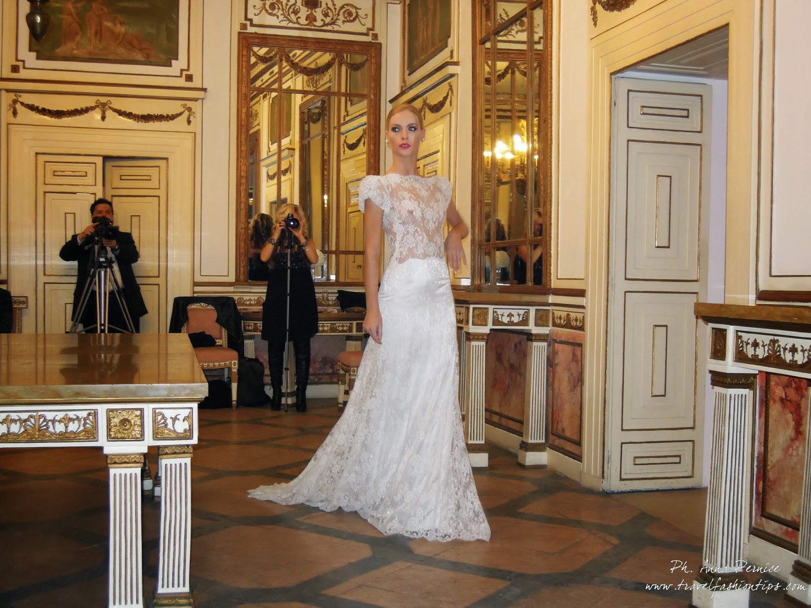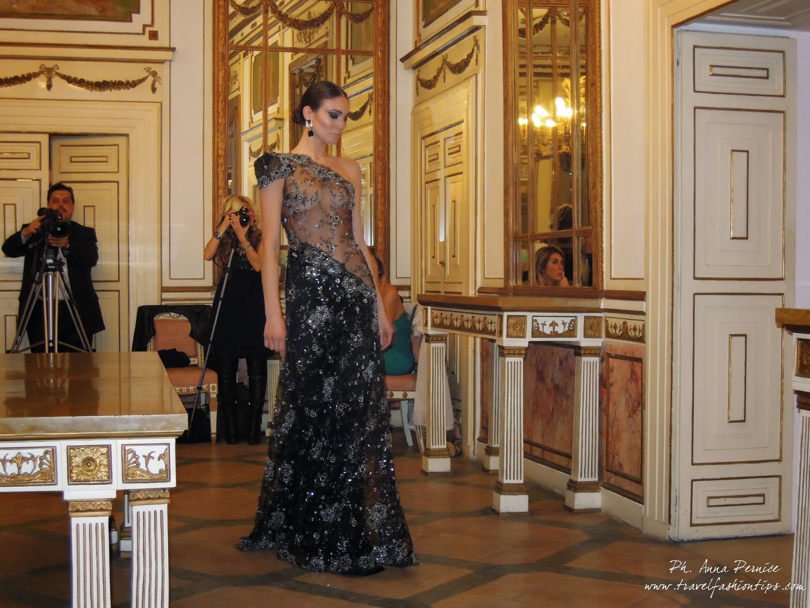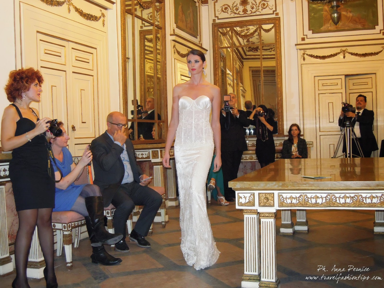 Nei saloni ottocenteschi del palazzo storico voluto dal duca Carlo Caracciolo di San Teodoro e realizzato dall’architetto toscano Guglielmo Bechi, hanno sfilato quaranta creazioni della collezione 2015 dello stilista partenopeo comprendenti 25 abiti da sposa, 10 abiti da sera e 5 modelli da uomo, indossati da 30 modelle e 5 modelli.