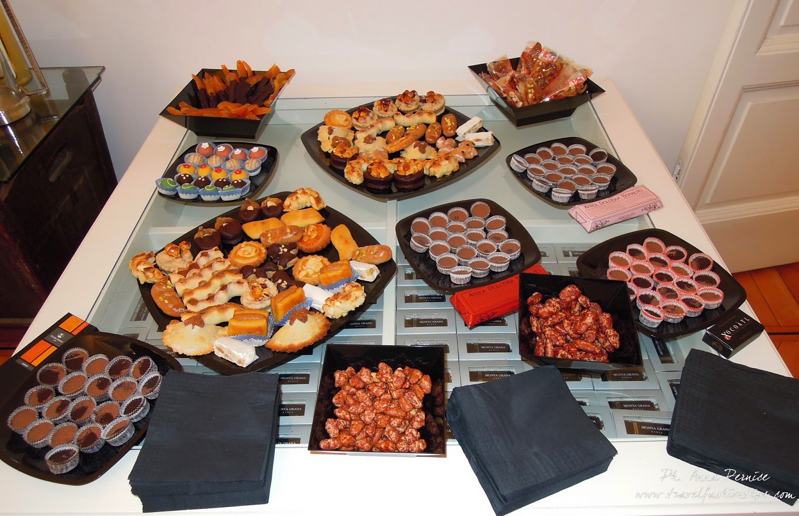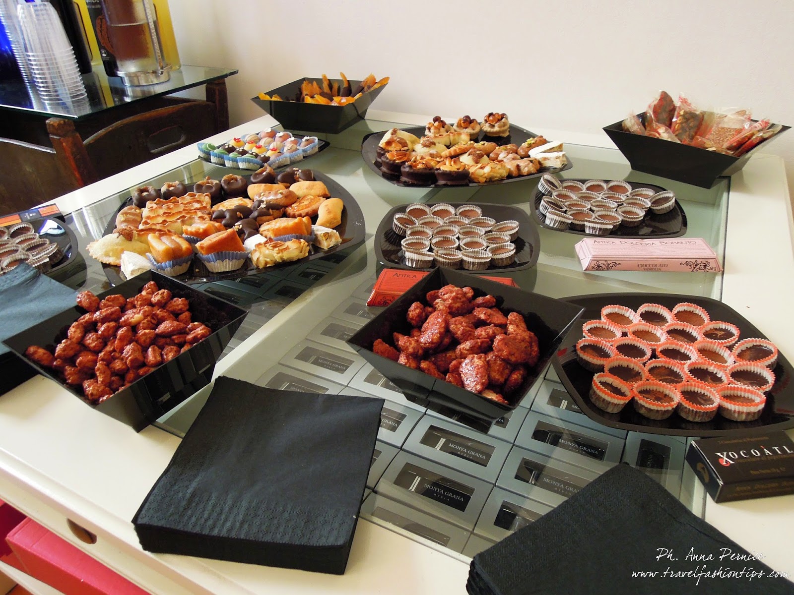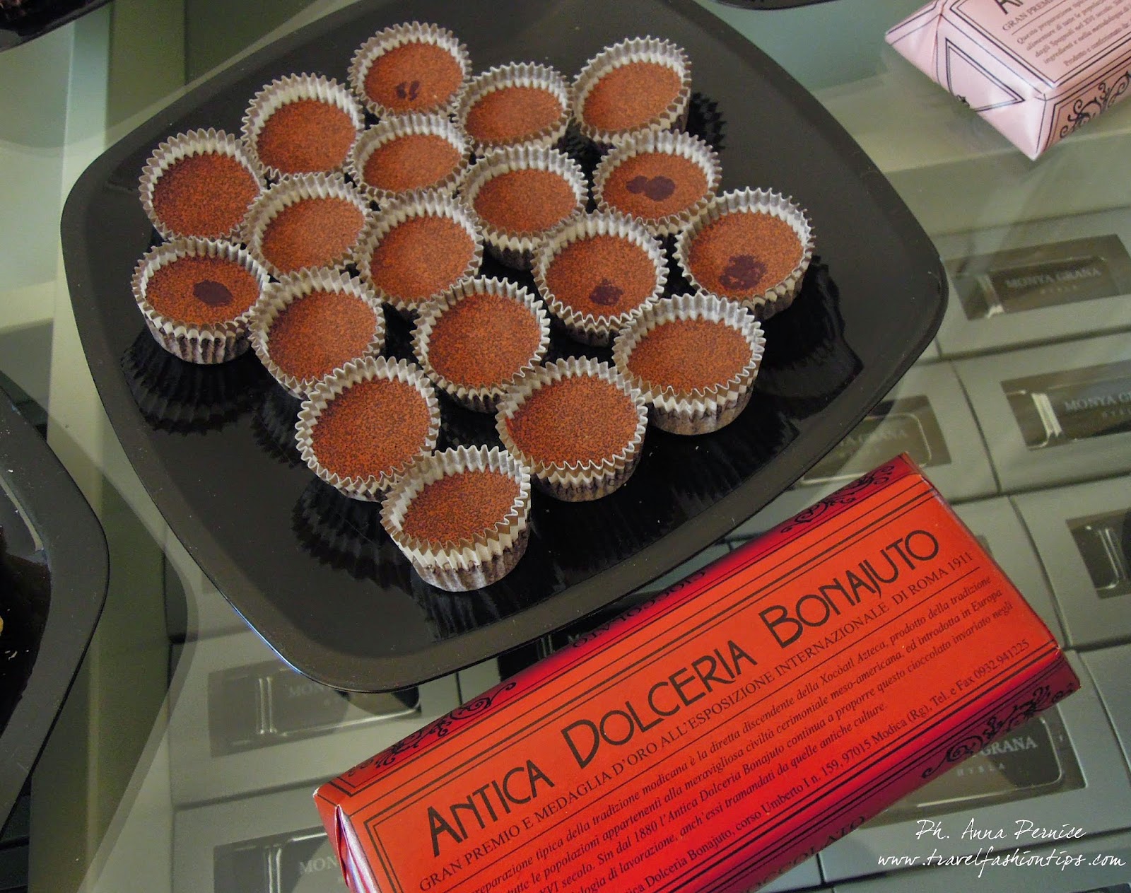 Mustaccioli ripieni, Mucatili, Filetti di mandorla, Palmette al cioccolato, Quaresimali, Marandine, Impanatiglie, Canestrini al cioccolato con nocciole, Canestrini al cioccolato con mandorle, Mignon di marzapane, Torrone artigianale ragusano, Fichi ricoperti al cioccolato, Scorzette di arancia, Scorzette di arancia al cioccolato, Mandorline caramellate, Cioccolato modicano di Bonajuto (famoso in tutto il mondo), all’arancia, alla vaniglia, al peperoncino, alla cannella. C’era inoltre il limoncello realizzato con limoni di Sicilia, Liquore al cioccolato, Caffè siciliano di Coffee Hour, succo d’arancia e bibite varie.