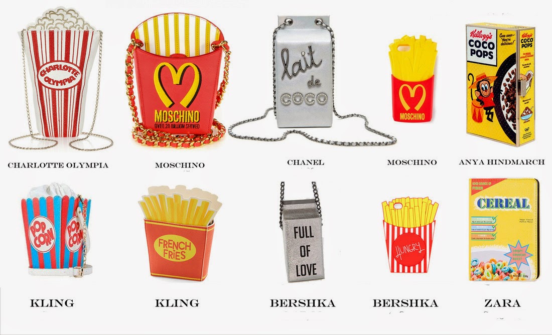 Alcuni brand, come Kling e Charollet Olympia, hanno riproposto borse a forma di contenitore dei pop corn, Bershka ha imitato la borsa a forma del cartone del latte di Chanel, mentre Zara ed Anya Hindmarch si sono ispirate ai cereali.