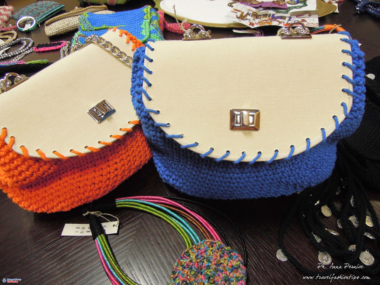 Seta, lana, alca tara, rafia, tuta, cotone si intrecciano per creare borse, bijoux, sciarpe, cappelli, scialli, stole ..tutti pezzi esclusivi e talvolta unici perché il loro intento è quello di creare accessori personalizzabili e versatili nelle forme e nelle dimensioni.