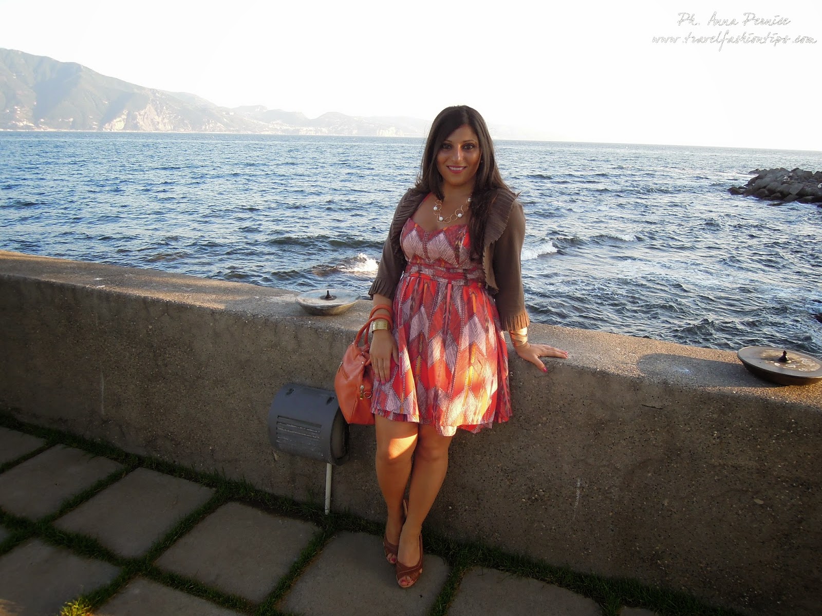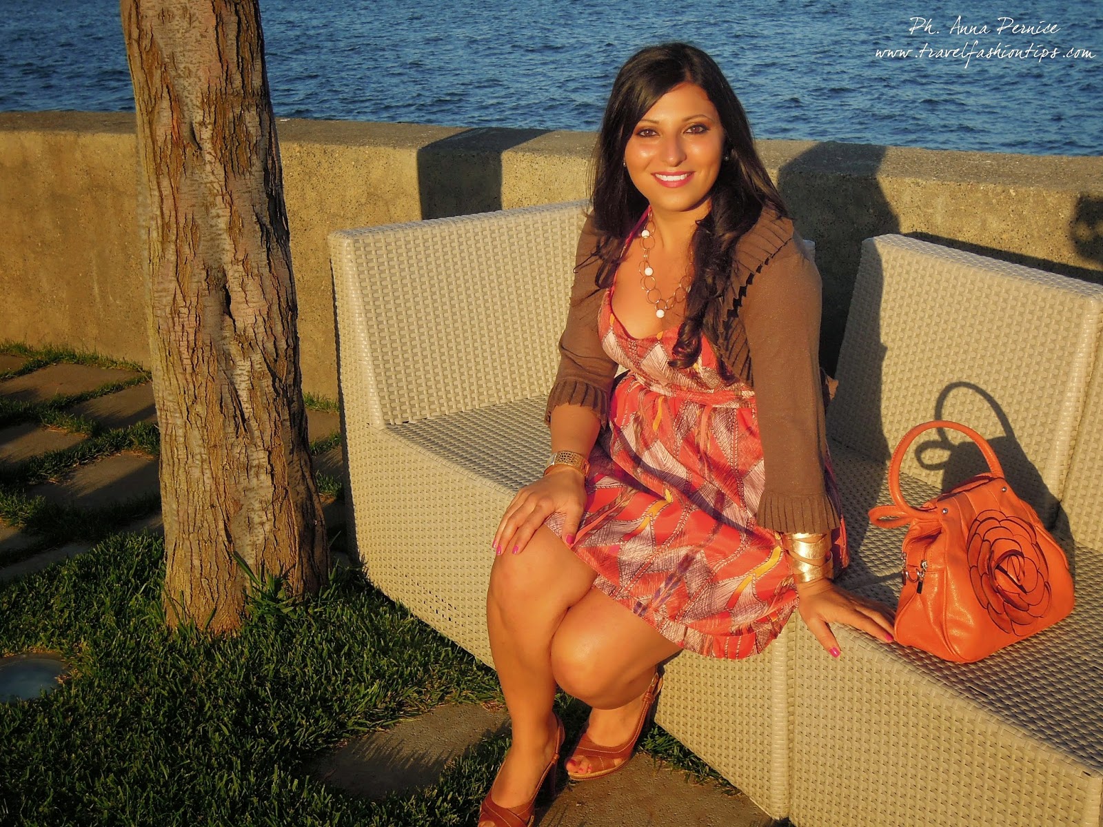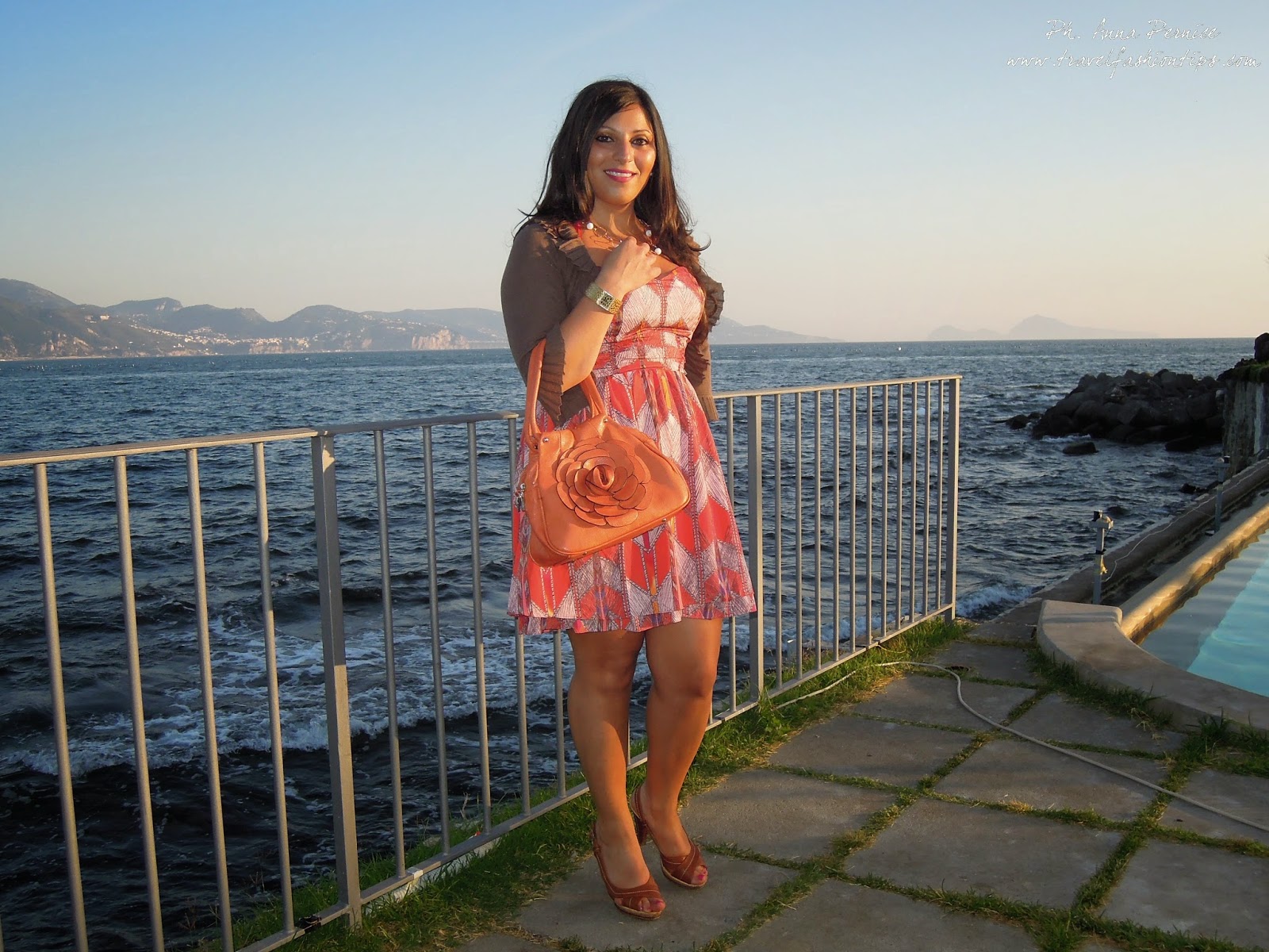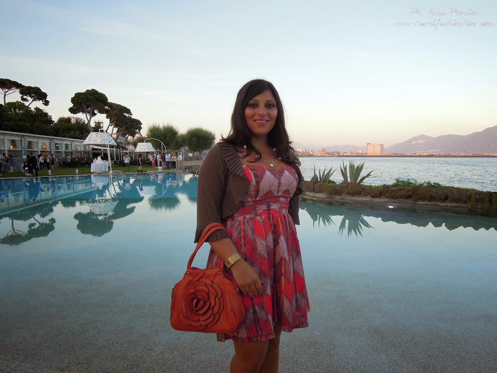 Ed ecco qui l’outfit che indossavo al Party di Mia Sposa Magazine che si è tenuto domenica scorsa a Villa Guarracino a Torre del Greco, una location elegante e lussuosa vicino al mare. Il party è iniziato nel pomeriggio ed ho quindi optato per un abitino corto al ginocchio con stampa azteca e sfumature arancio della Guess acquistato sul sito PiuStyle. L’ho abbinato a dei sandali in cuoio e borsa arancio con fiore. Temevo che in riva al mare ci fosse un pò di vento e quindi ho indossato un giacchino con manica a 3/4 Liu Jo.