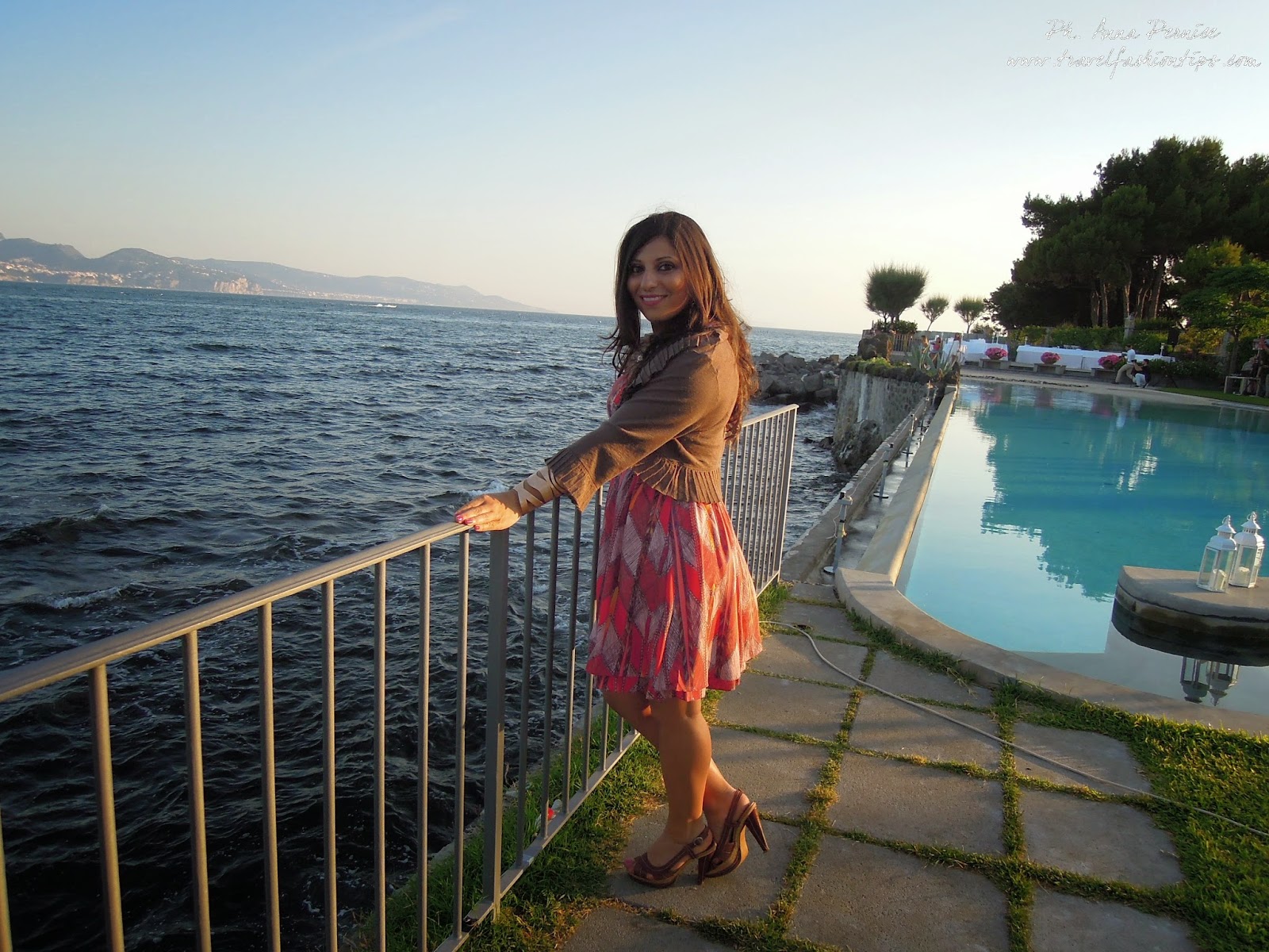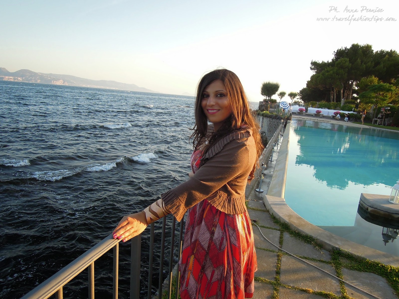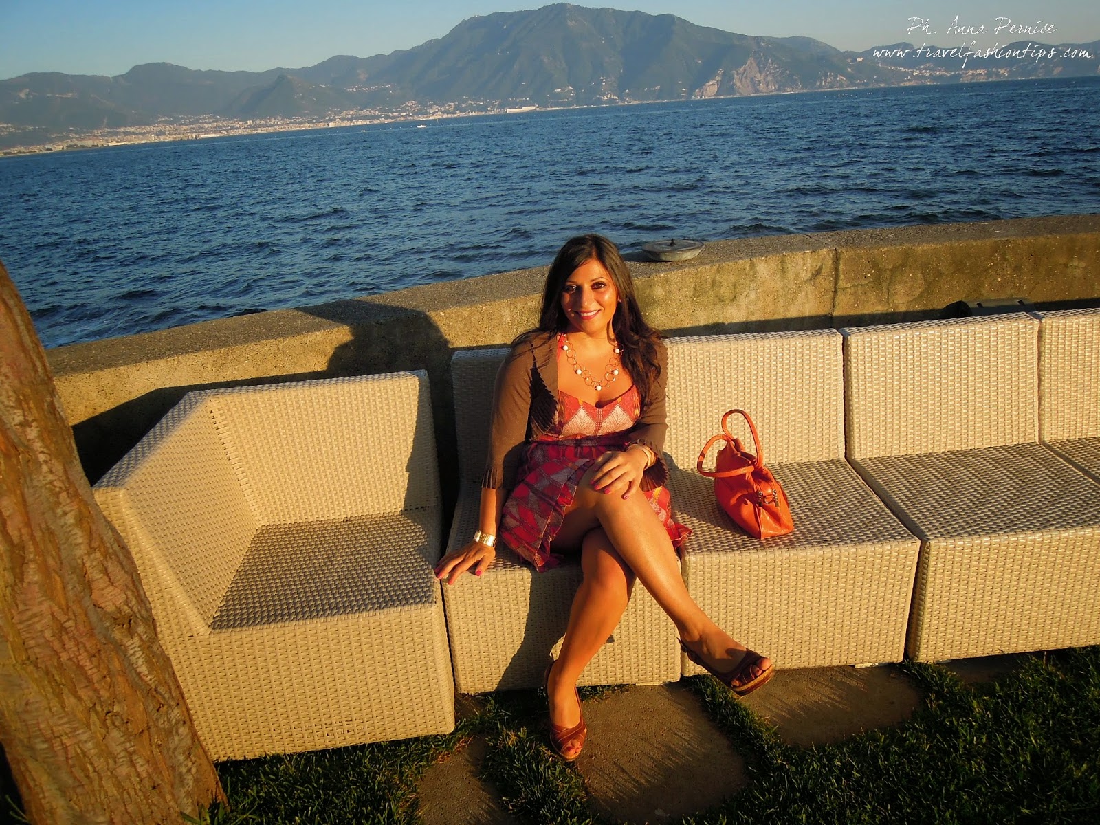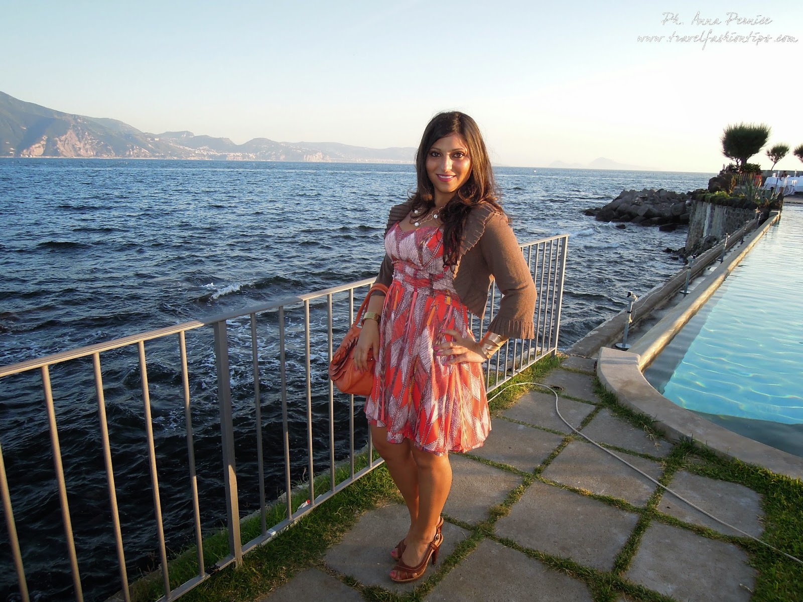 Ed ecco qui l’outfit che indossavo al Party di Mia Sposa Magazine che si è tenuto domenica scorsa a Villa Guarracino a Torre del Greco, una location elegante e lussuosa vicino al mare. Il party è iniziato nel pomeriggio ed ho quindi optato per un abitino corto al ginocchio con stampa azteca e sfumature arancio della Guess acquistato sul sito PiuStyle. L’ho abbinato a dei sandali in cuoio e borsa arancio con fiore. Temevo che in riva al mare ci fosse un pò di vento e quindi ho indossato un giacchino con manica a 3/4 Liu Jo.