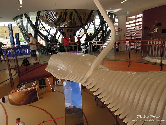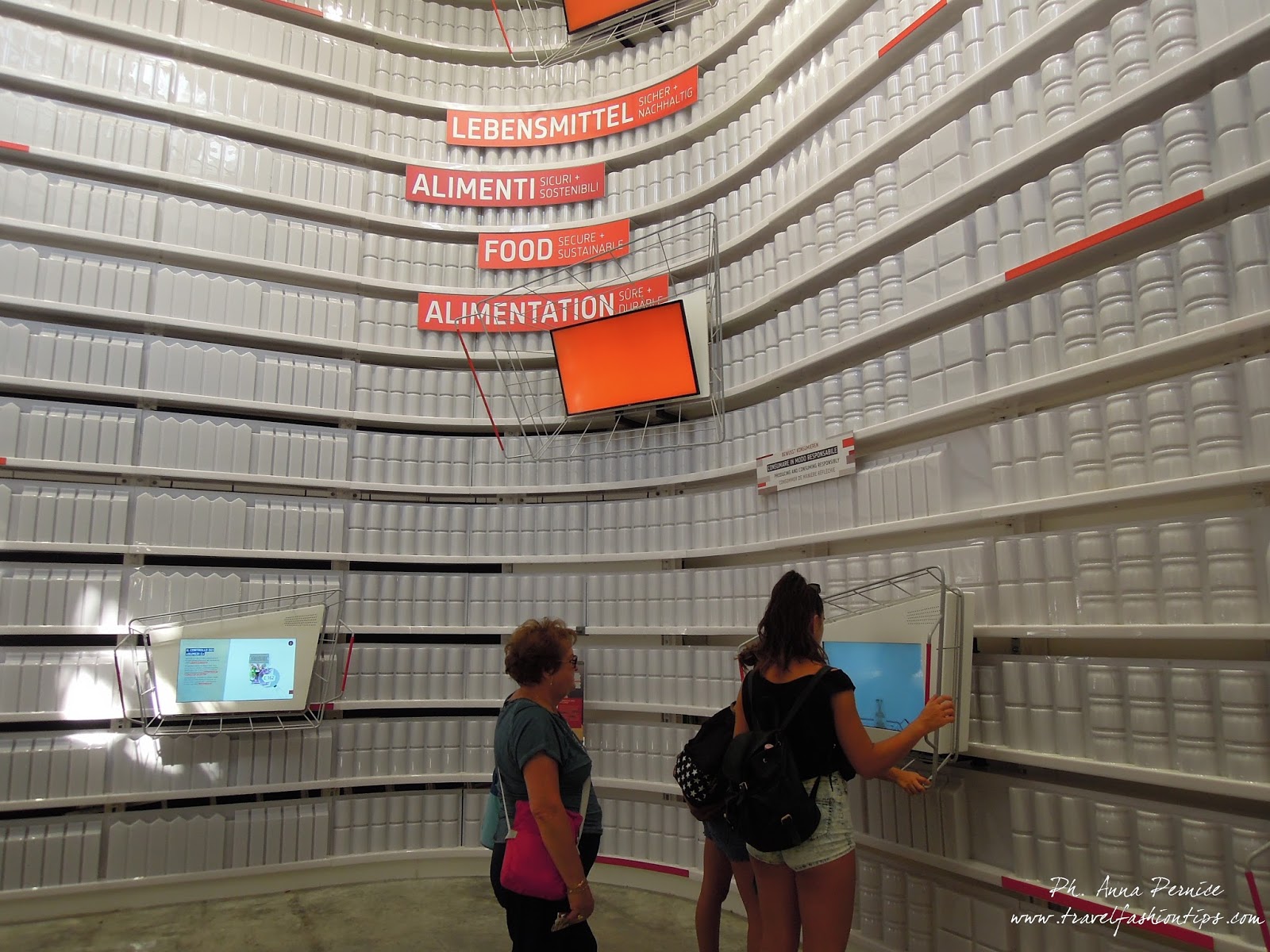 Il progetto del Padiglione Svizzero, denominato «Confooderatio Helvetica» della società di architetti Netwerch, è stato selezionato nel 2012 da una giuria di esperti tra 103 proposte pervenute nell’ambito del concorso internazionale promosso da Presenza Svizzera del DFAE. Il team di giovani architetti di Brugg ha saputo convincere la giuria d’esperti con un messaggio chiaro, capace di stimolare la riflessione sulla responsabilità personale, sull’equa ripartizione dei beni alimentari e sulla sostenibilità. Il Padiglione svizzero – con una superficie di 4433 m2 – presenta, infatti, una grande piattaforma aperta con quattro torri visibili da lontano, riempite di prodotti alimentari. I visitatori accedono alle torri attraverso gli ascensori e, una volta arrivati in cima, possono servirsi di prodotti. Man mano che le torri si svuotano le piattaforme sui cui poggiano si abbassano, modificando la struttura del Padiglione svizzero. Il progressivo svuotamento delle torri è registrato in tempo reale e può essere seguito anche sui media sociali. In questo modo, il Padiglione svizzero presenta al grande pubblico le sfide principali legate allo sviluppo sostenibile ed al consumo responsabile. Il viaggio nelle torri segue questo filo conduttore sulla base della propria esperienza personale e offrire così lo spunto per una riflessione sulla disponibilità degli alimenti nel mondo e sullo sviluppo sostenibile lungo tutta la filiera alimentare. I visitatori possono portare con sé o consumare le quantità di prodotto che desiderano. Saranno il comportamento di consumo e la responsabilità personale di ognuno a stabilire quanto resterà per chi viene dopo e per quanto tempo. Peccato che quando sono andata io a visitare il Padiglione Svizzero il 19 luglio erano già finite quasi tutte le scorte. Era rimasta solo qualche scorta di caffè e di sale, mentre le altre scorte erano già terminate, perchè ogni persona aveva preso più di una scorta per sè e per tutta la sua famiglia!
