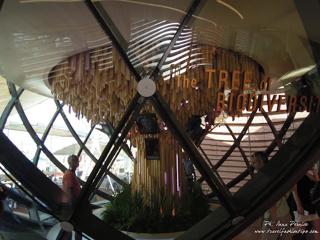 Queste strutture collegano lo spazio interno del padiglione, ossia la sua esposizione, con quello esterno, ponendo così in stretta relazione architettura e contenuto. I “germogli di idee“ non solo offrono ombra, bensì, grazie alla presenza sulla loro superficie dei moduli fotovoltaici organici (OPV), sono anche in grado di generare energia, diventando così “alberi solari“. Il Padiglione Tedesco rappresenta il primo grande progetto architettonico internazionale nel quale viene impiegata questa tecnologia innovativa. Il tema scelto è “Fields of Ideas”. La prima parte del percorso del Padiglione tedesco illustra le fonti dell’alimentazione (suolo, acqua, clima e biodiversità). Nello spazio “Il mio giardino di idee” ogni visitatore può interagire con il materiale esposto per ottenere ulteriori informazioni multimediali. Il gran finale è lo show “Be(e)active”: i visitatori possono sperimentare un volo sulla Germania (attraverso 3mila schermi che proiettano paesaggi tedeschi) dalla prospettiva di due api in volo, il cui movimento è diretto da un direttore d’orchestra (io però non l’ho visto perchè c’erano dei problemi tecnici).