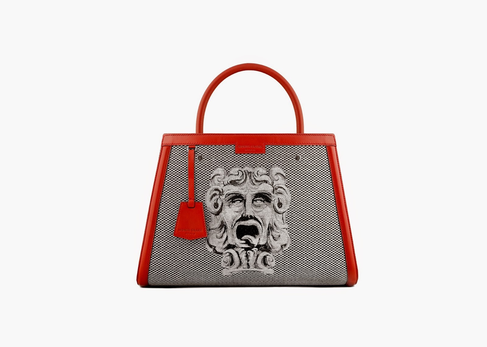 La collezione si distacca da tutte quelle degli altri Brand, comprende infatti un solo modello di borsa artigianale, come pezzo unico d’arte da poter indossare. Realizzato in due colori, in due varianti di mascheroni differenti ed elaborato in uno dei più prestigiosi laboratori toscani, con materiali 100% italiani e di altissima qualità, provenienti anch’essi dalla Toscana. Il corpo della borsa è realizzato in tessuto jagart con immagine intramata (non stampata e non ricamata) da entrambe le parti, le rifiniture sono tutte in pelle di vitello di prima scelta, l’interno in raso con trame in seta. Tali materiali rendono il modello adatto sia per le stagioni invernali che estive.
