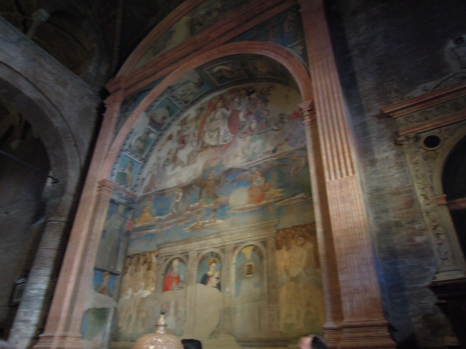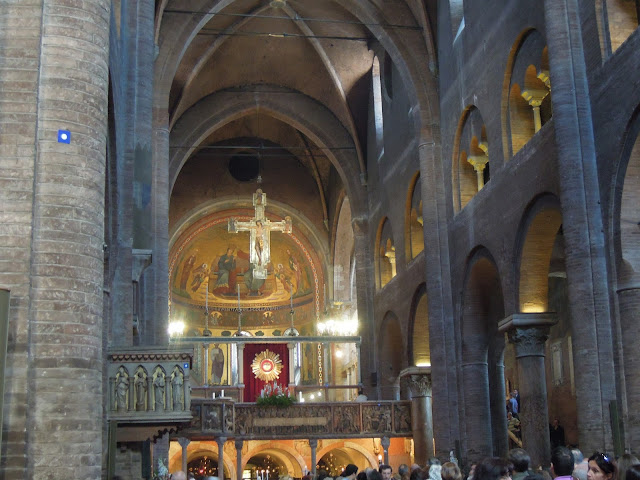 Capolavoro dello stile romanico, fu edificato dall’architetto Lanfranco nel sito del sepolcro di san Geminiano, patrono di Modena, dove in precedenza, a partire dal V secolo, erano state già erette due chiese. Appena entrata, sono rimasta incantata dalla sua bellezza. Mi ha colpito, in particolare la scultura/pittura del Cristo che pendeva sospesa dal soffitto sull’altare. Mi ha ricordato gli studi di storia dell’arte fatti al liceo!