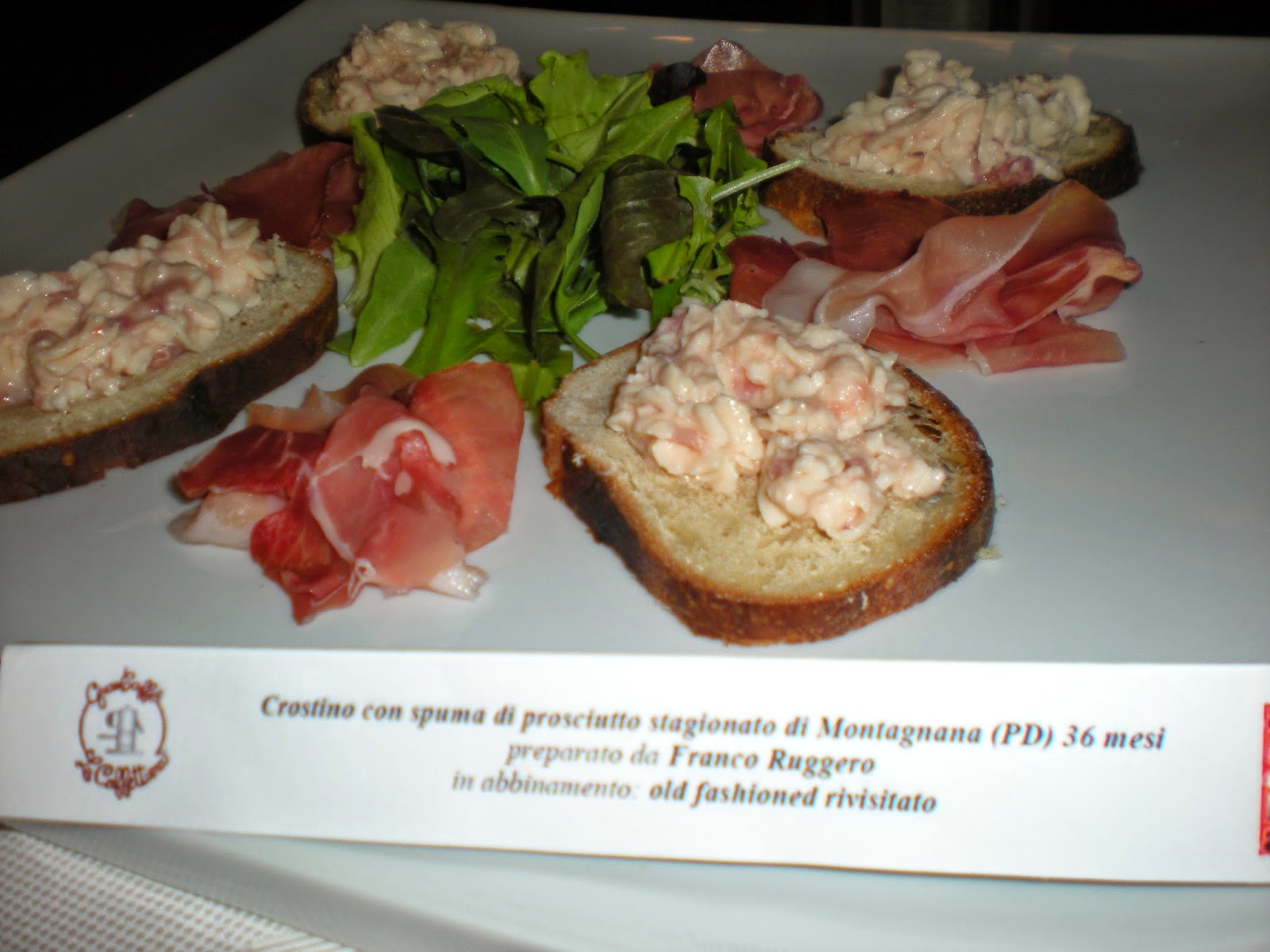 Crostino con spuma di prosciutto stagionato di Montagnana (PD) 36 mesi preparato da Franco Ruggero con in abbinamento: old fashioned rivisitato.