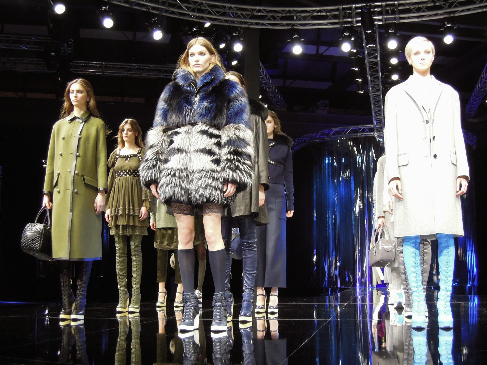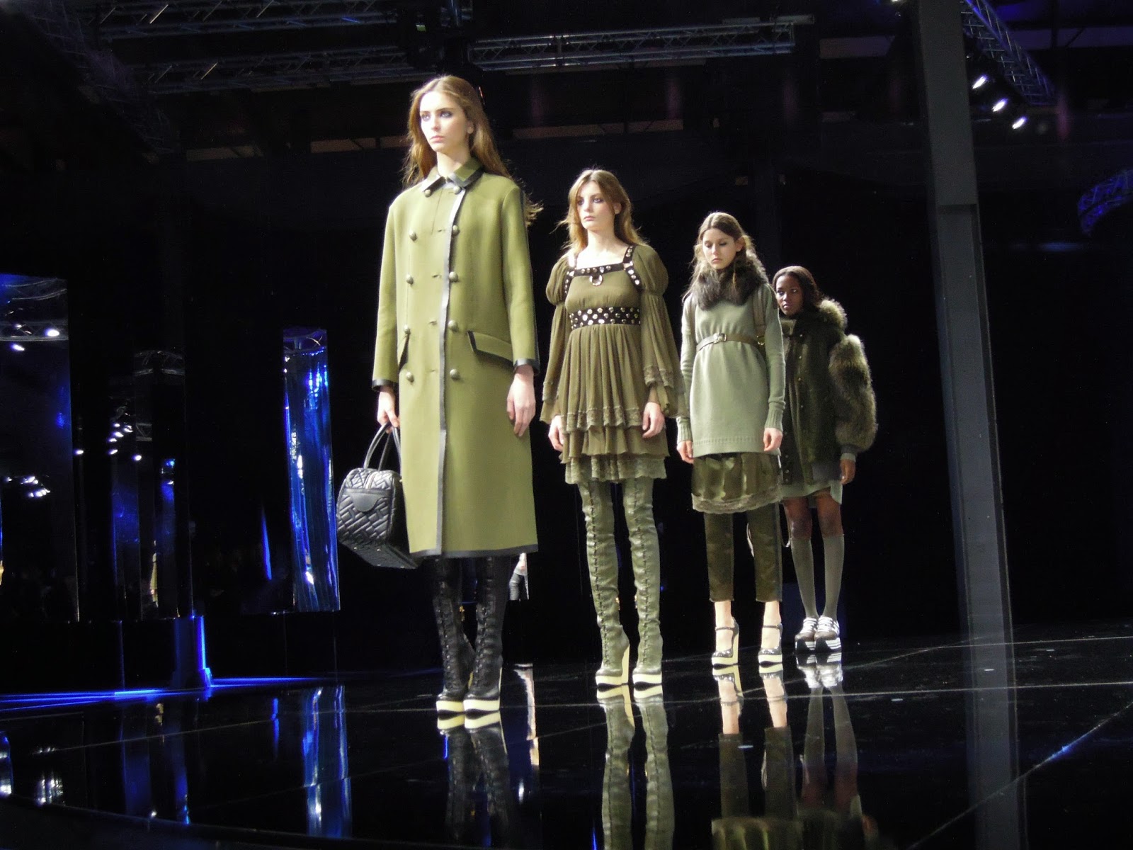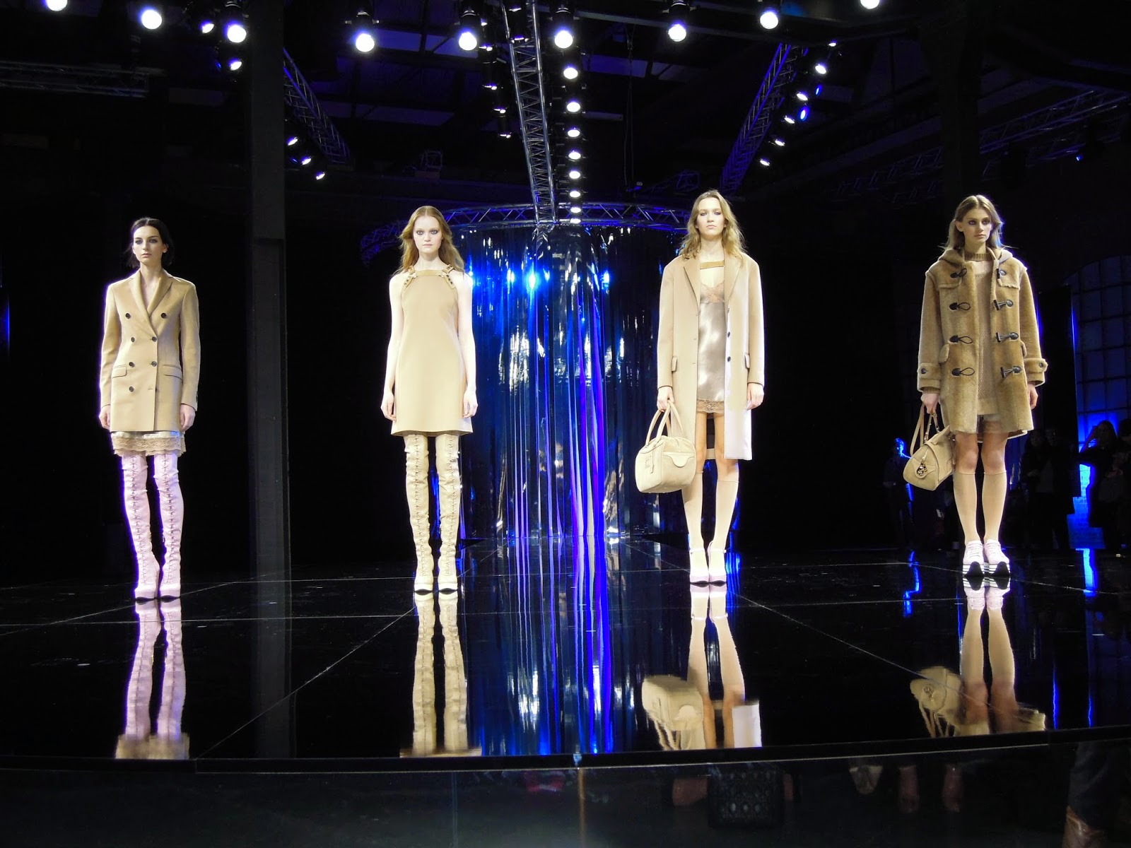 Colori che ritroviamo su cappotti in cammello abbinati a shorts e abiti sottoveste in raso e pizzo color carne, portati con stivali zeppa in nappa stretch rosa, vestiti in chiffon e suede verde militare abbinati a stivali in nappa elasticizzata, cappotti in shearling grigio con maglioni in lana cashmere, pantaloni in flanella e minigonne in raso e pizzo indossati con sneakers blu, maglie in lana cashmere, pantacollant in lana, mary janes in vernice nav, cappotti in lana e vestiti con stampa effetto “spigato” bianco-nero e sneakers con zeppa e maxi-log.