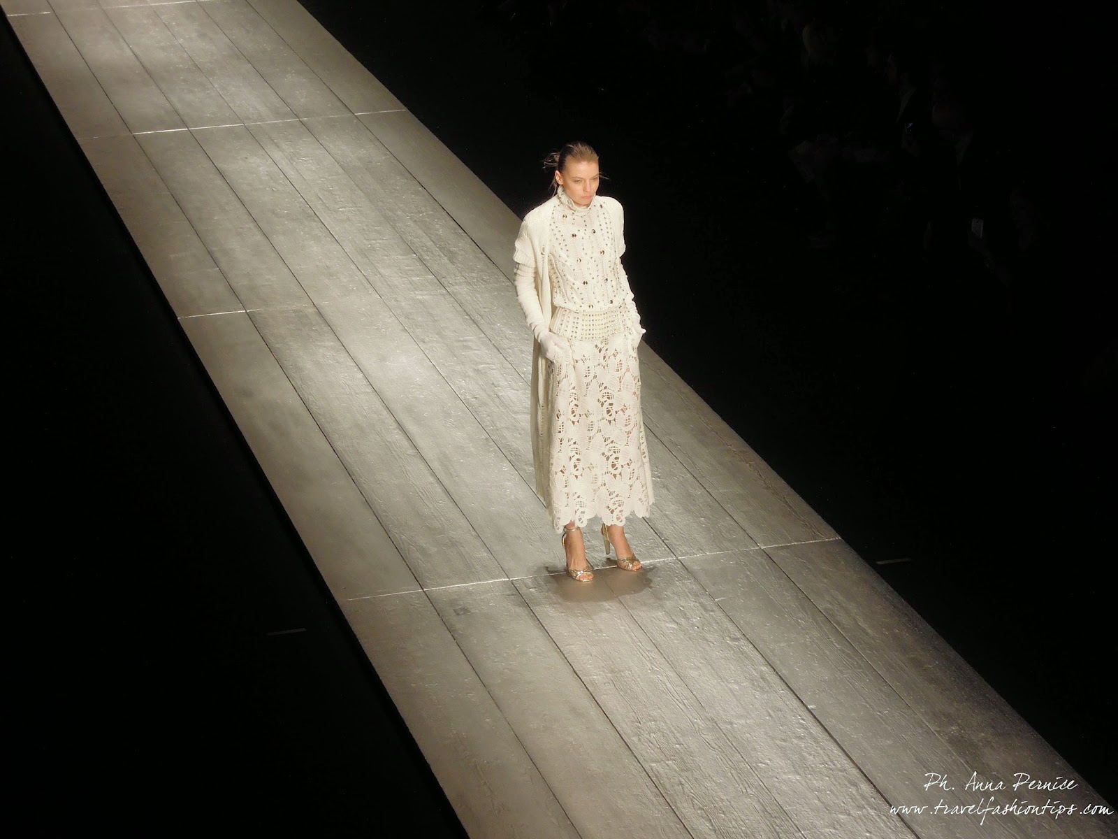 Abiti leggerissimi dell’iconica linea a “bambola” con le balze, si alternano a tute con pieghe plissettate, gonne voluminose, tubini ricamati con le maniche di pelo e paletot dalla linea Sixties.