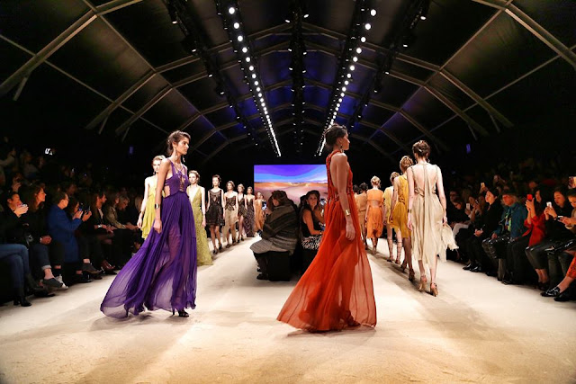 Dominano principalmente i colori della sabbia, ma non mancano anche il viola, il nero ed il ruggine che danno un tocco bohemien alle donne del deserto di Alberta Ferretti. Nella palette cromatica troviamo anche il bianco, arancio in diverse gradazioni, giallo, viola e verde.