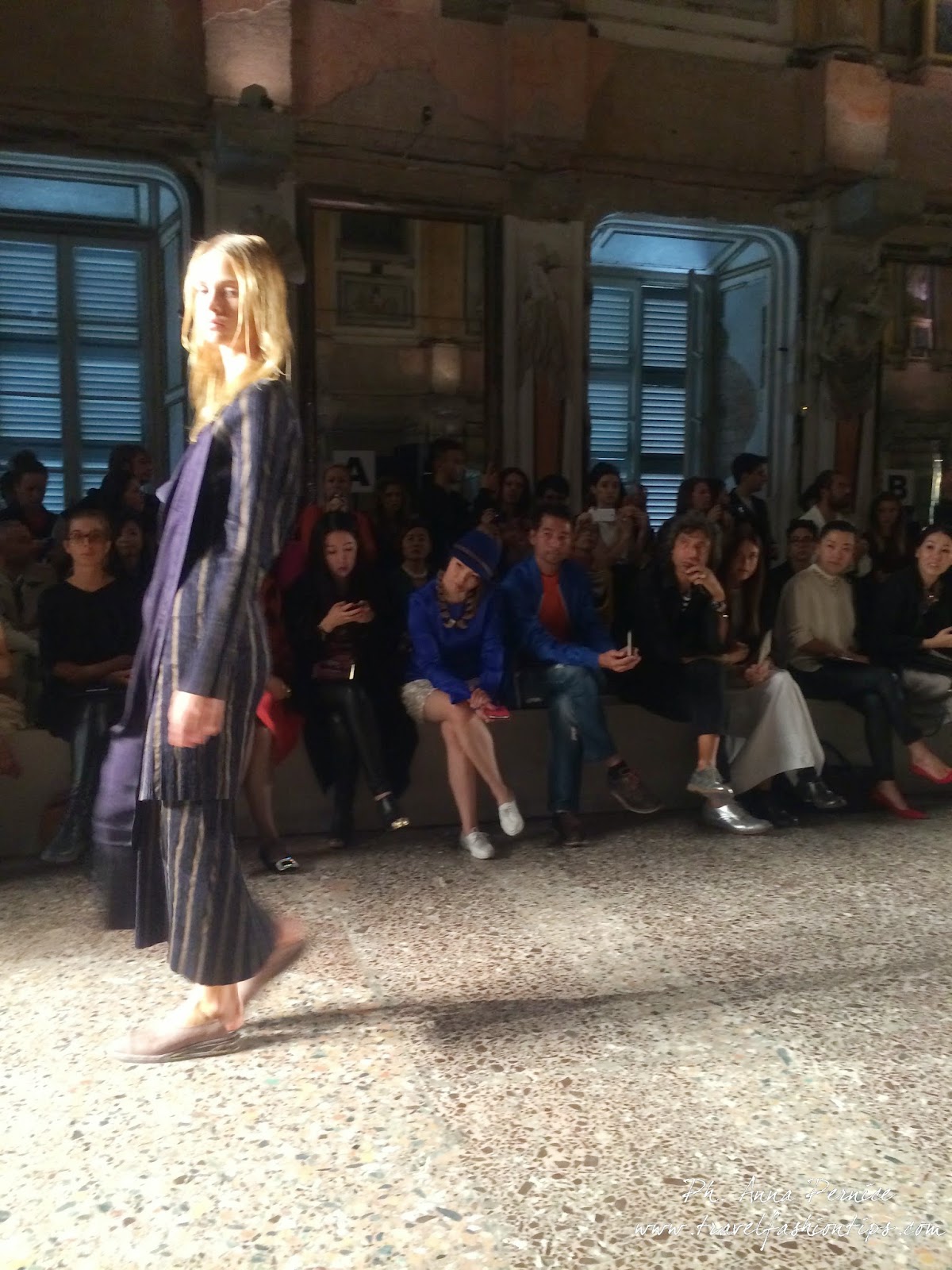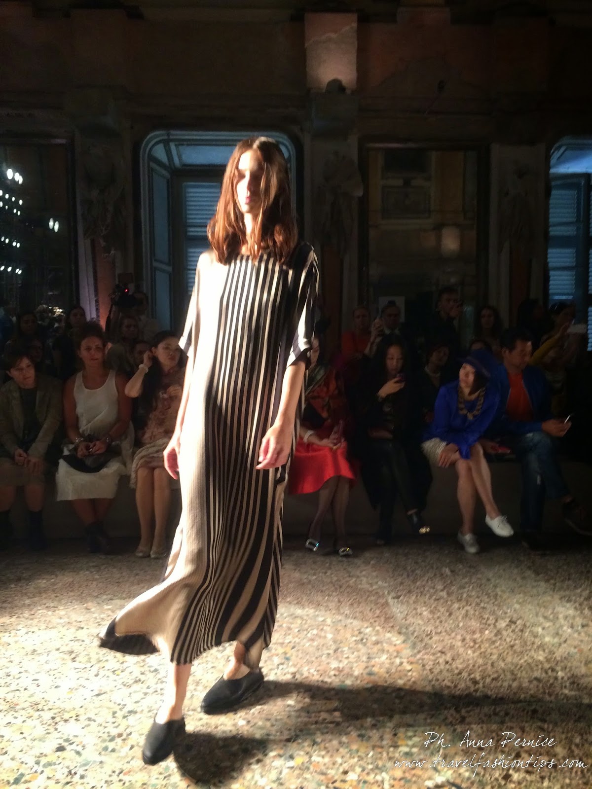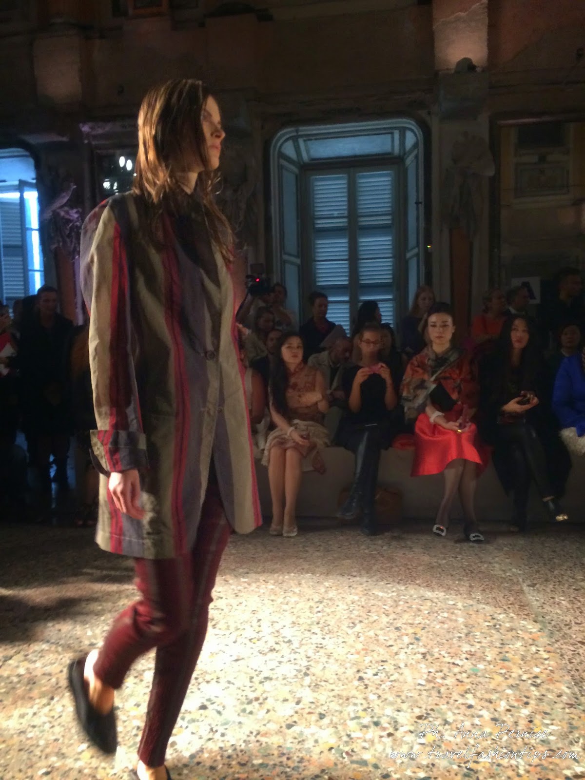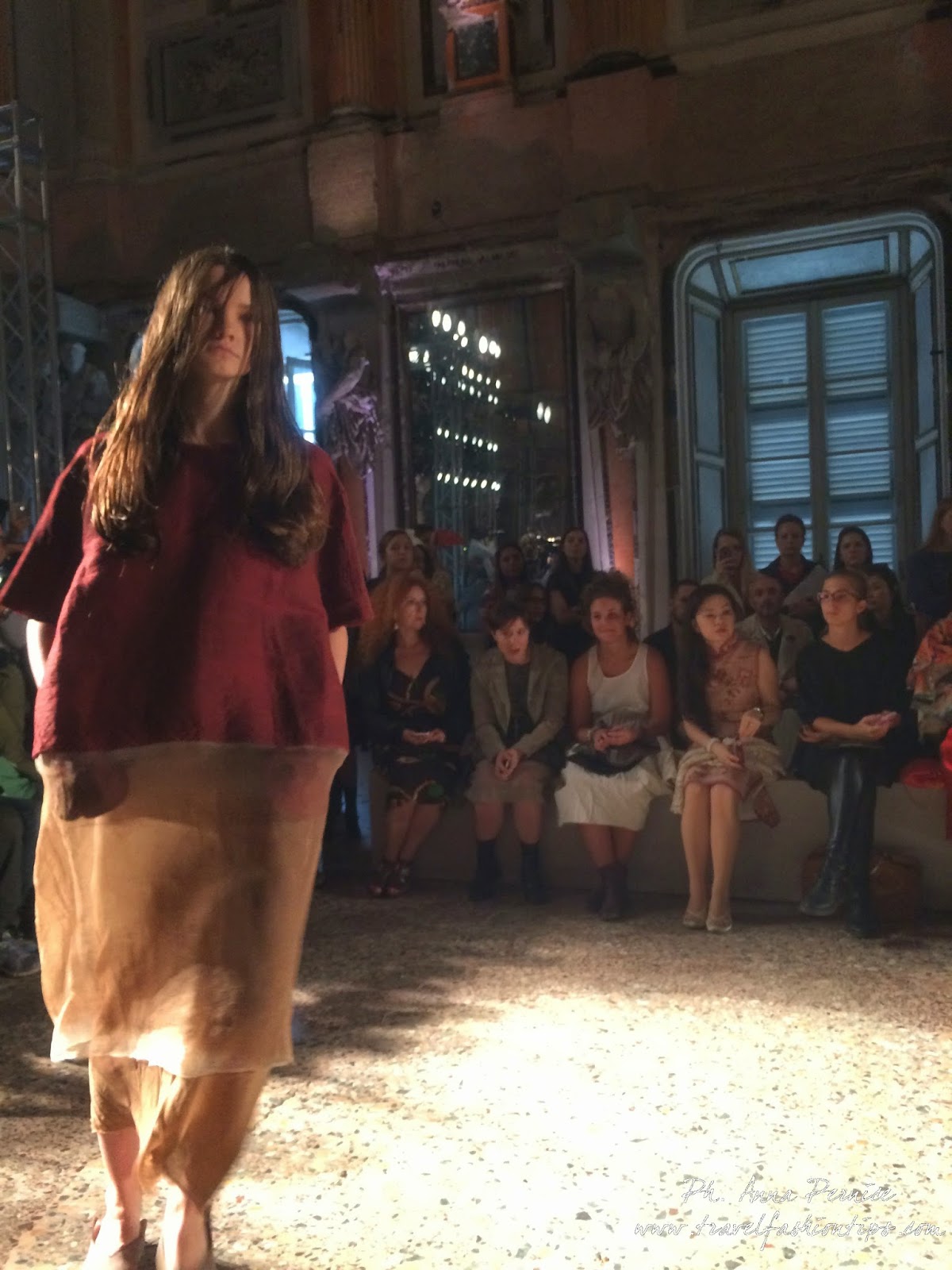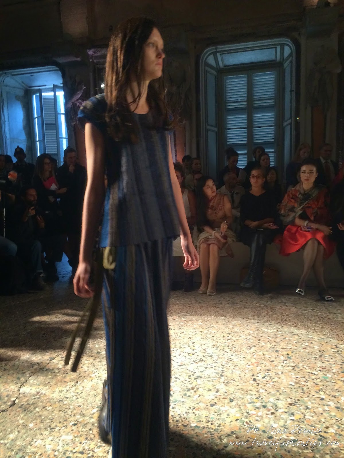 Gli abiti nascono dall’incontro tra pesante e leggero: tuniche dai volumi over e dai colori imperfetti, bordeaux, color carne e blu, pezzi maschili come le giacche in jacquard, completi simil pijama in seta e ampi vestiti multirighe. Ogni capo è diverso dall’altro, ed evoca allo stesso tempo oriente e occidente, a svelare ancora la doppia anima della stilista.