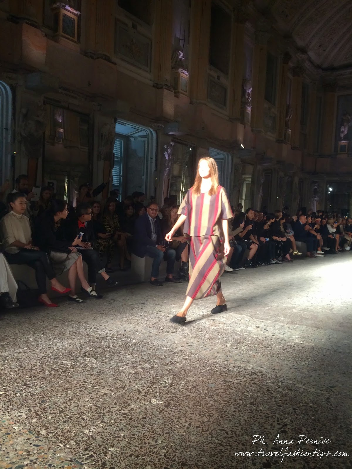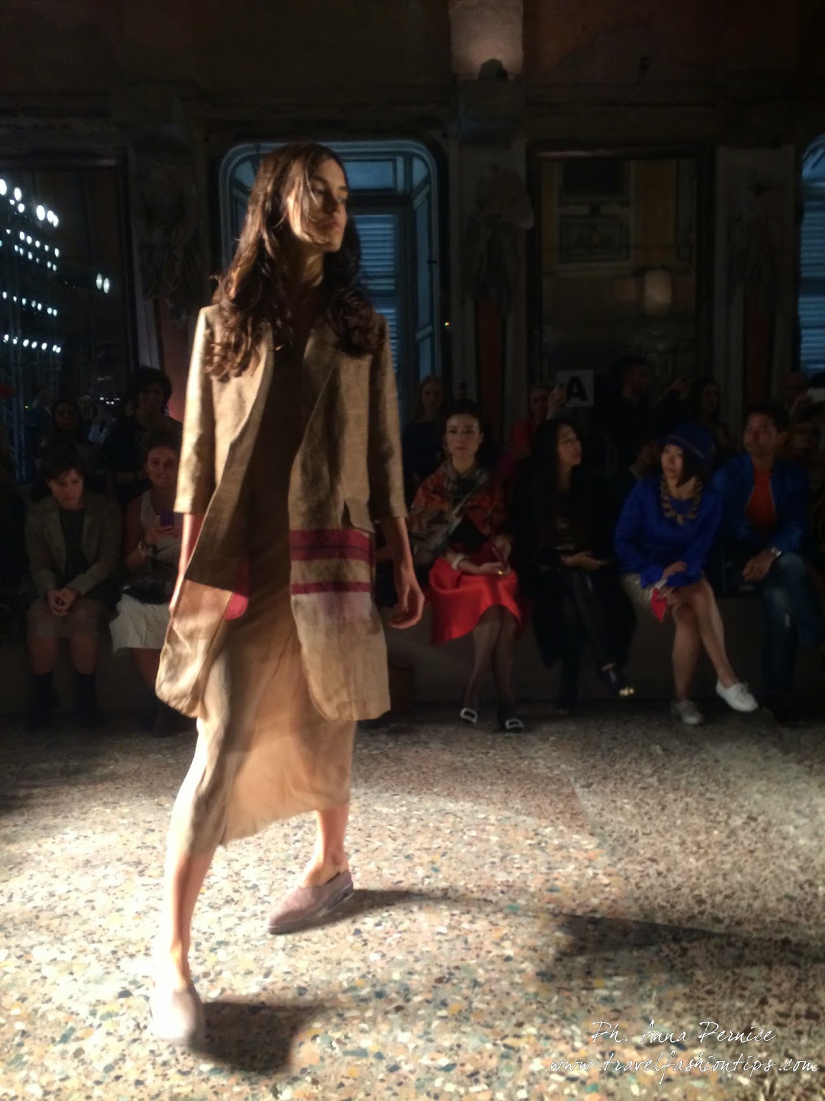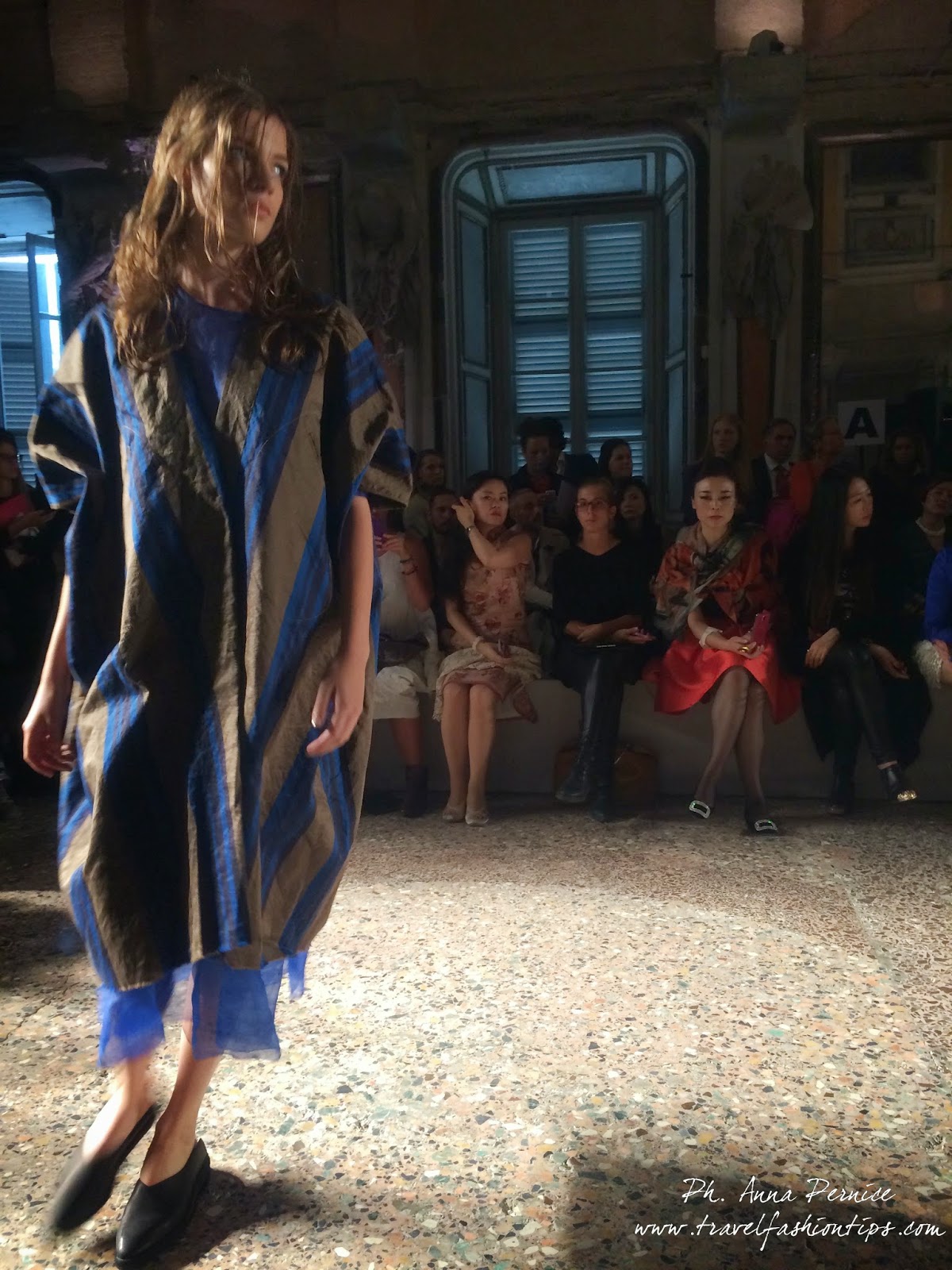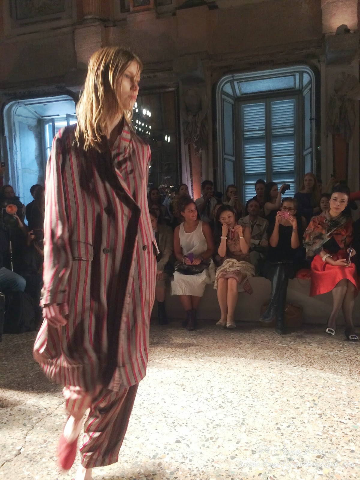 Gli abiti nascono dall’incontro tra pesante e leggero: tuniche dai volumi over e dai colori imperfetti, bordeaux, color carne e blu, pezzi maschili come le giacche in jacquard, completi simil pijama in seta e ampi vestiti multirighe. Ogni capo è diverso dall’altro, ed evoca allo stesso tempo oriente e occidente, a svelare ancora la doppia anima della stilista.