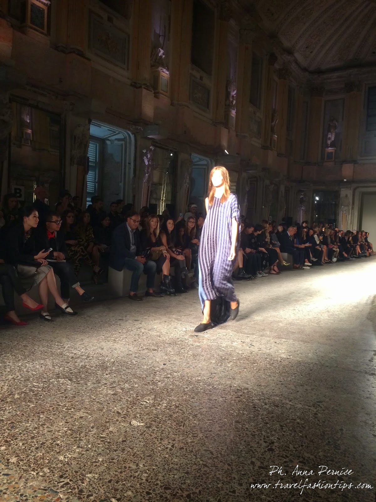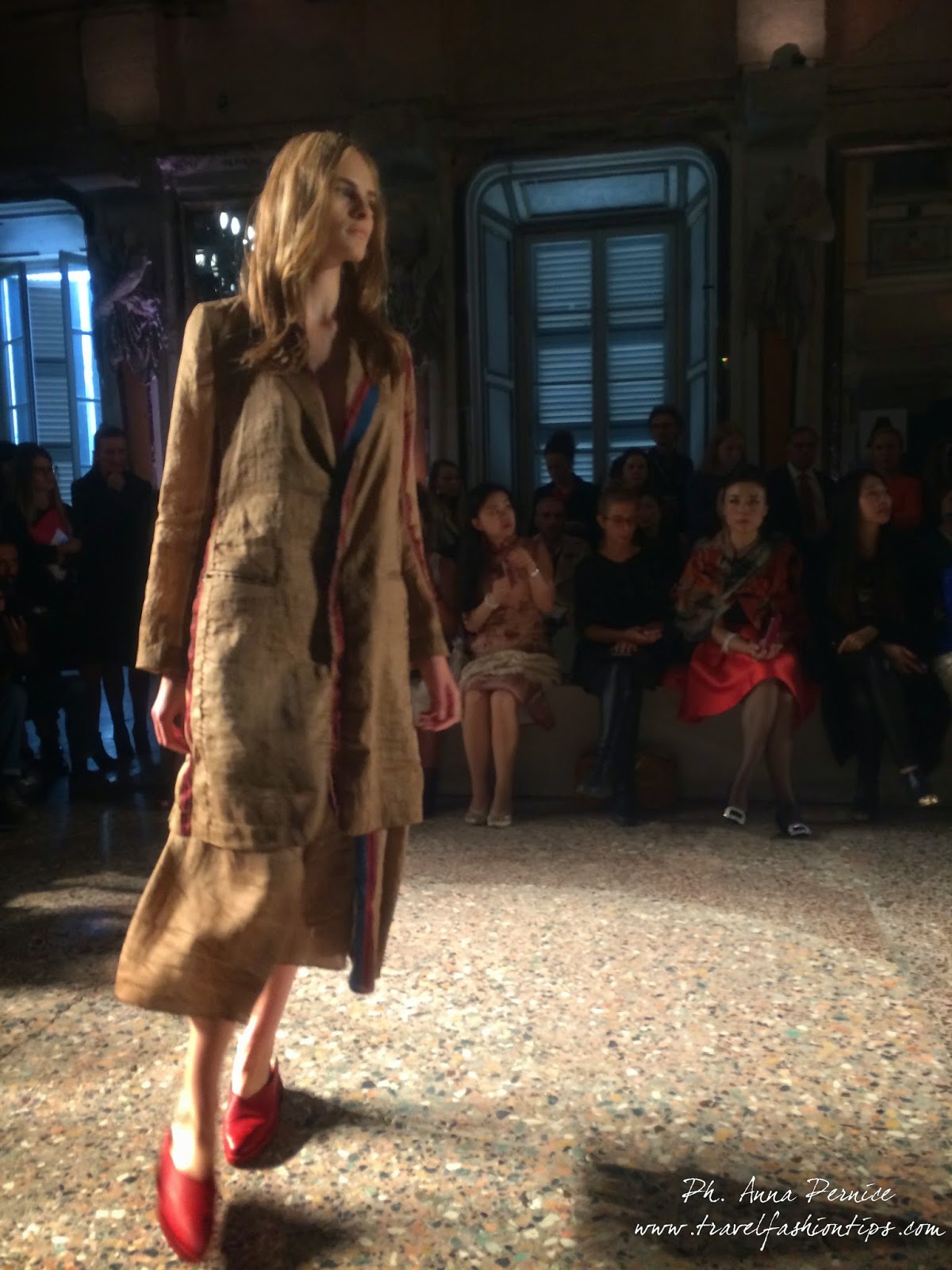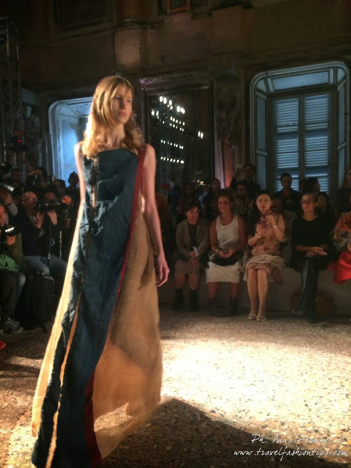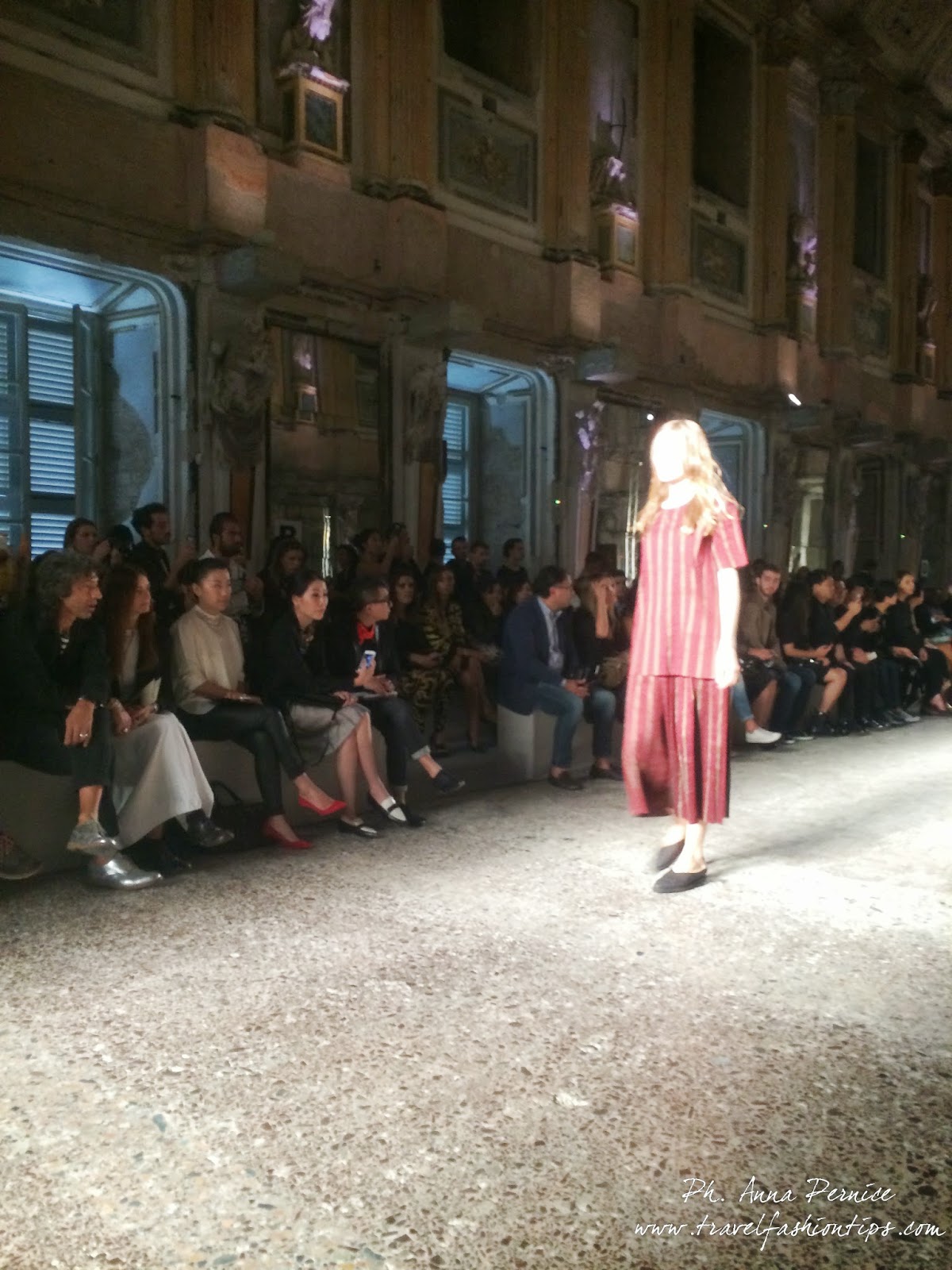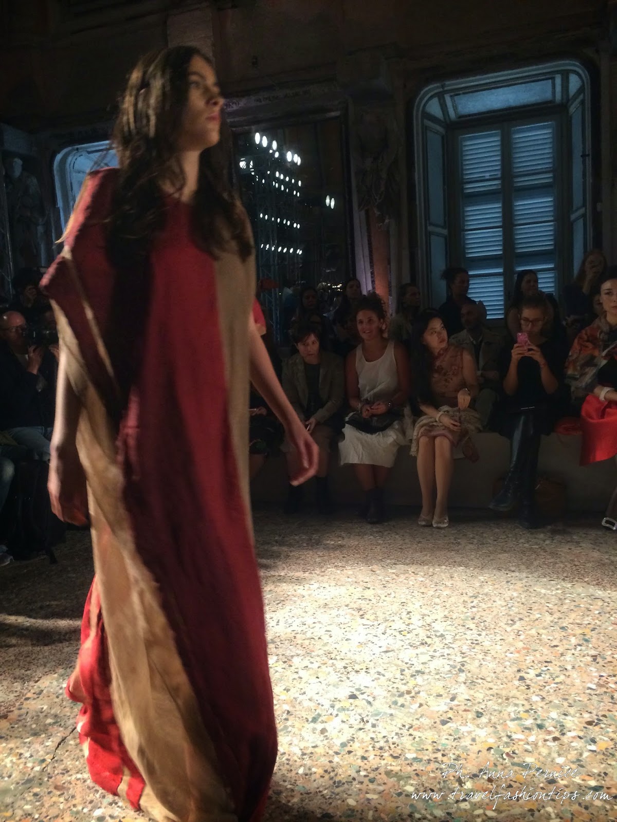 Gli abiti nascono dall’incontro tra pesante e leggero: tuniche dai volumi over e dai colori imperfetti, bordeaux, color carne e blu, pezzi maschili come le giacche in jacquard, completi simil pijama in seta e ampi vestiti multirighe. Ogni capo è diverso dall’altro, ed evoca allo stesso tempo oriente e occidente, a svelare ancora la doppia anima della stilista.