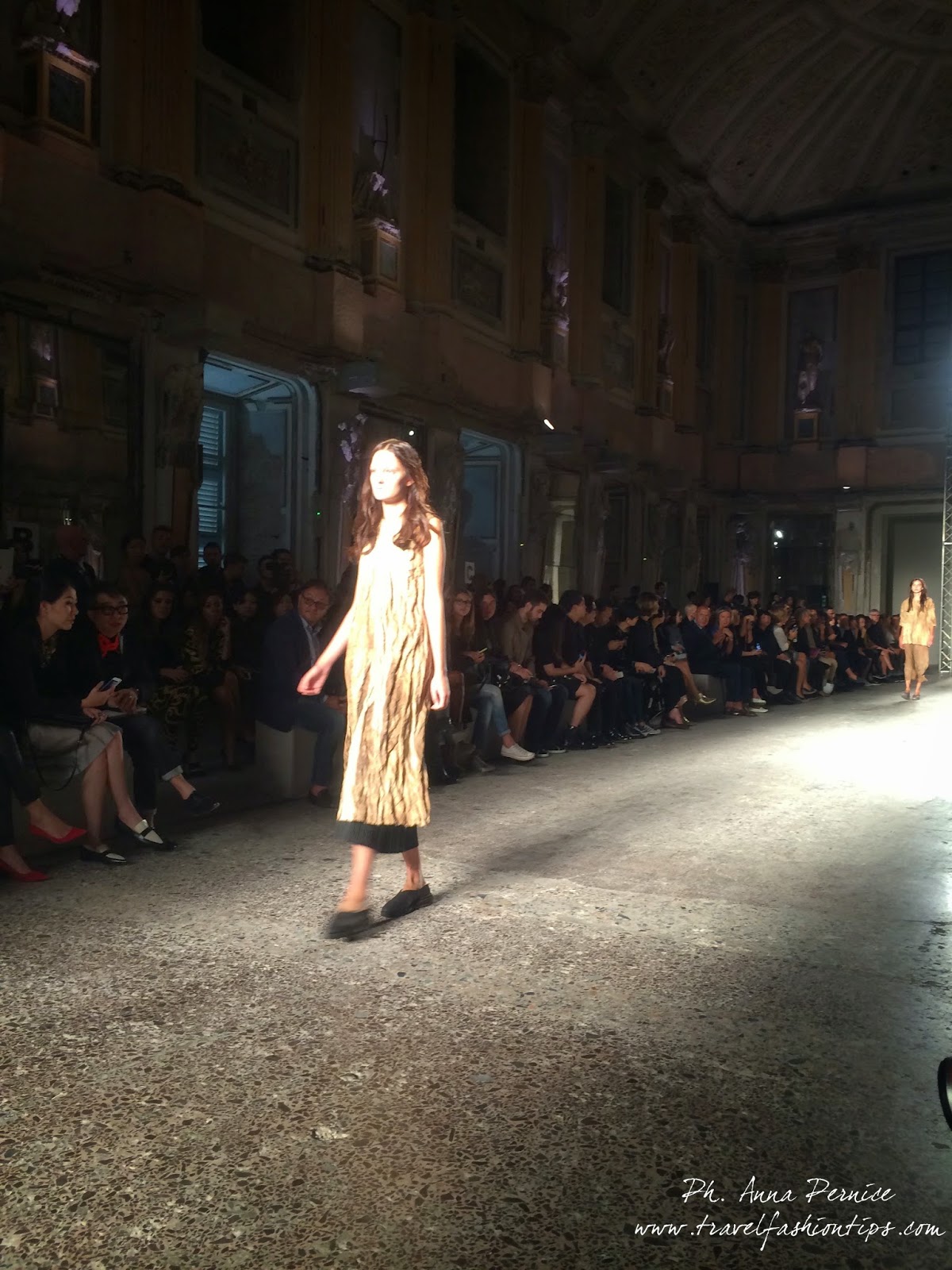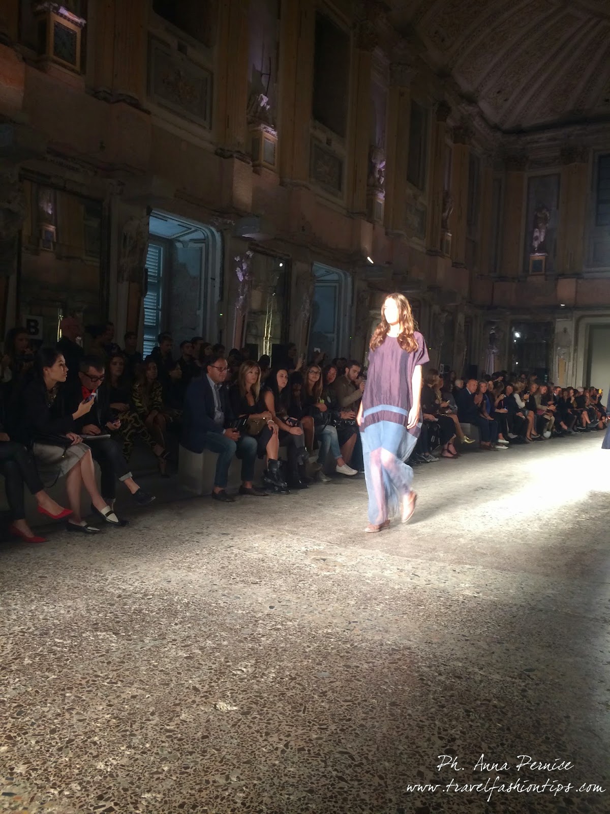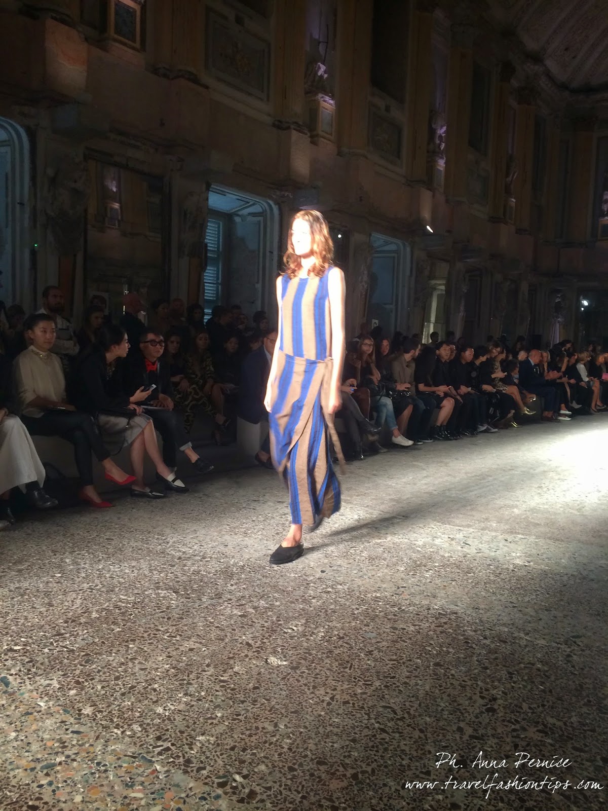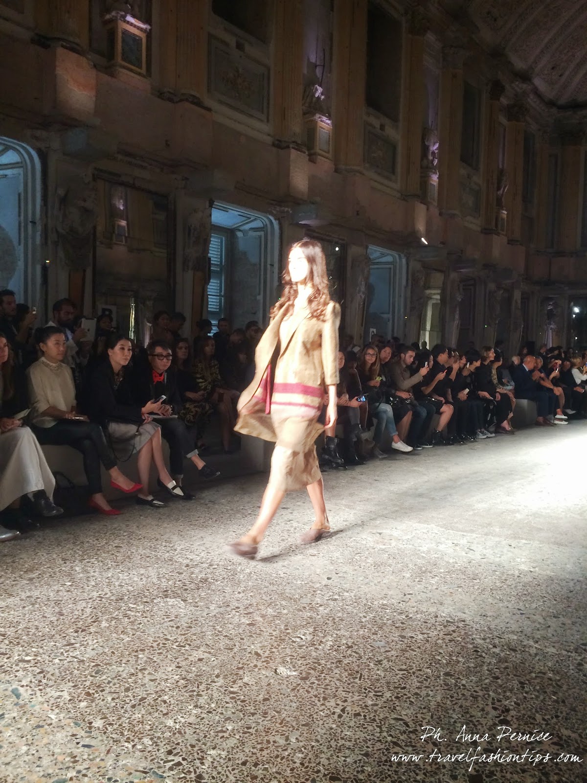 Gli abiti nascono dall’incontro tra pesante e leggero: tuniche dai volumi over e dai colori imperfetti, bordeaux, color carne e blu, pezzi maschili come le giacche in jacquard, completi simil pijama in seta e ampi vestiti multirighe. Ogni capo è diverso dall’altro, ed evoca allo stesso tempo oriente e occidente, a svelare ancora la doppia anima della stilista.