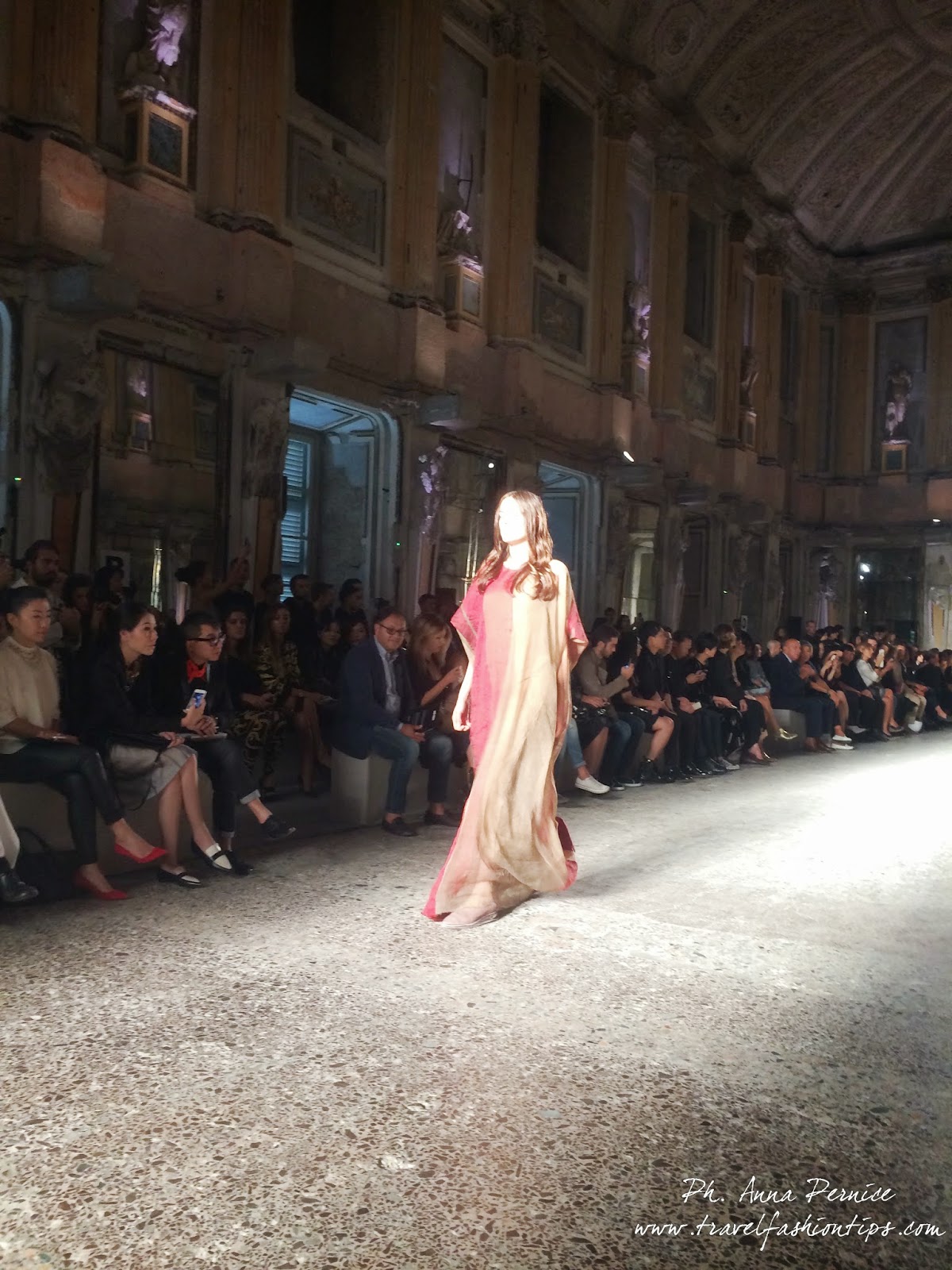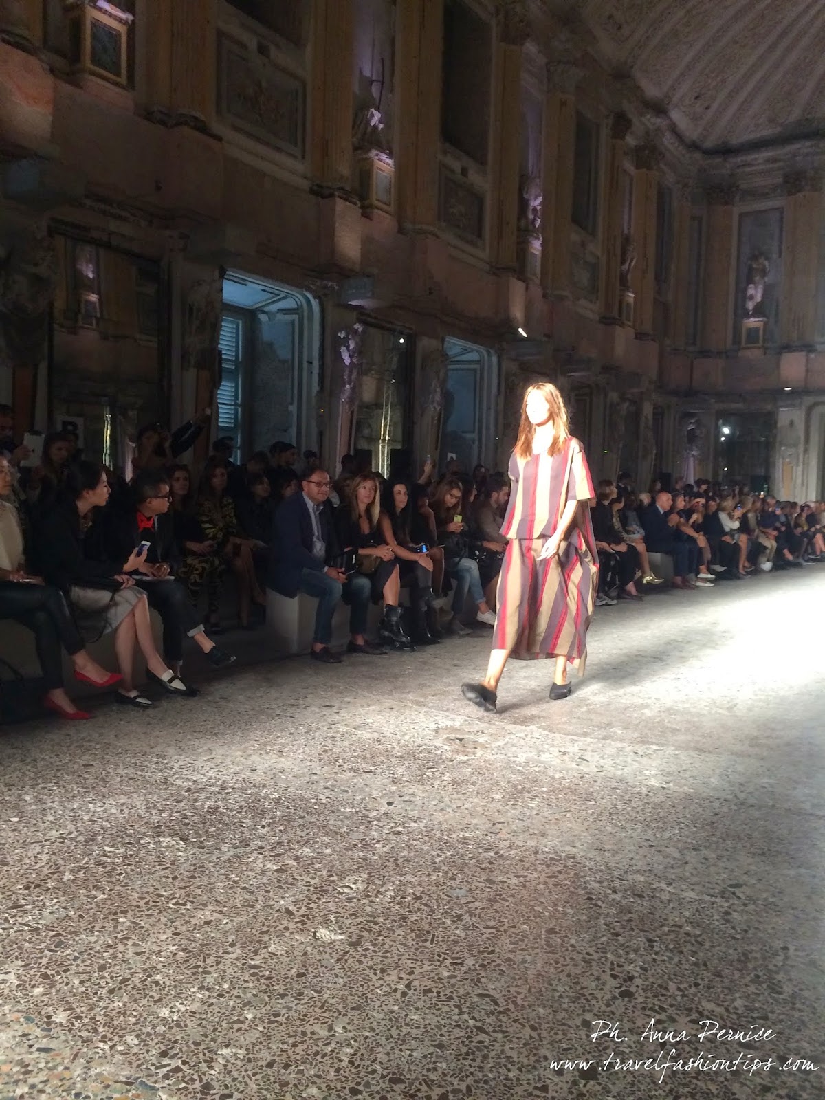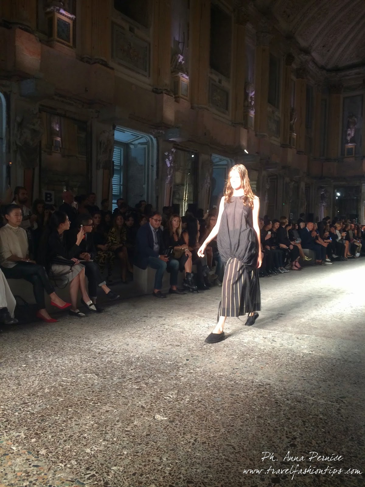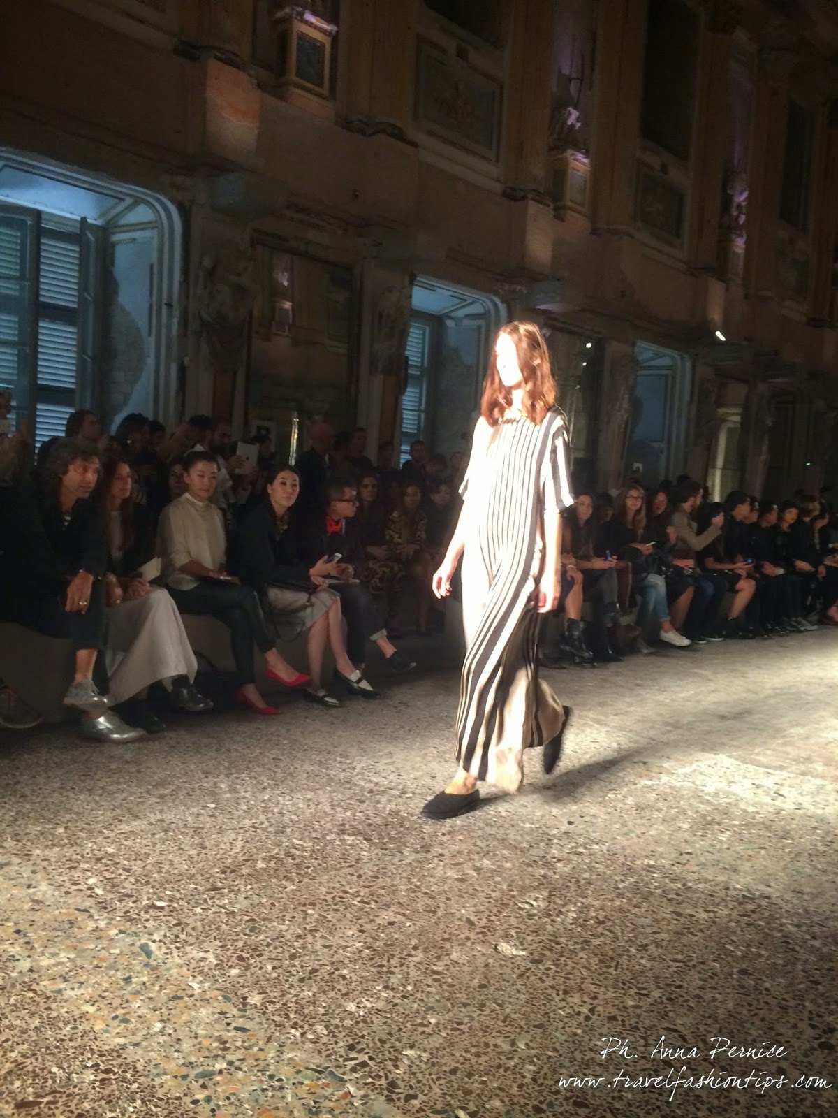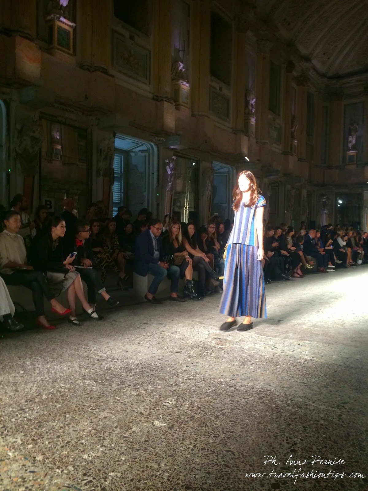 Gli abiti nascono dall’incontro tra pesante e leggero: tuniche dai volumi over e dai colori imperfetti, bordeaux, color carne e blu, pezzi maschili come le giacche in jacquard, completi simil pijama in seta e ampi vestiti multirighe. Ogni capo è diverso dall’altro, ed evoca allo stesso tempo oriente e occidente, a svelare ancora la doppia anima della stilista.