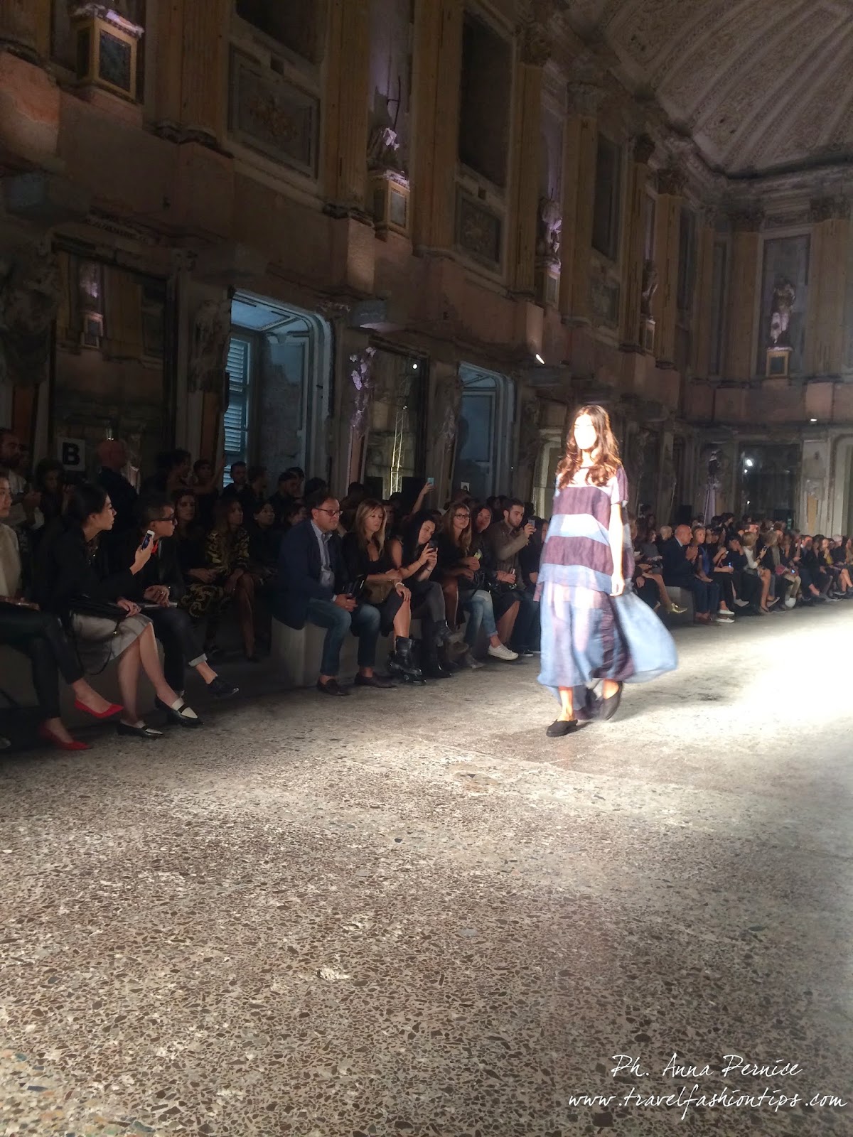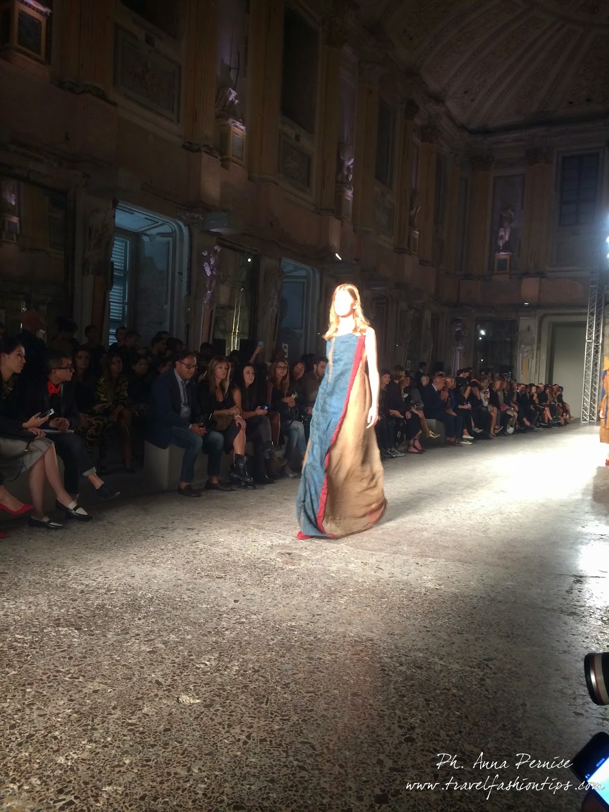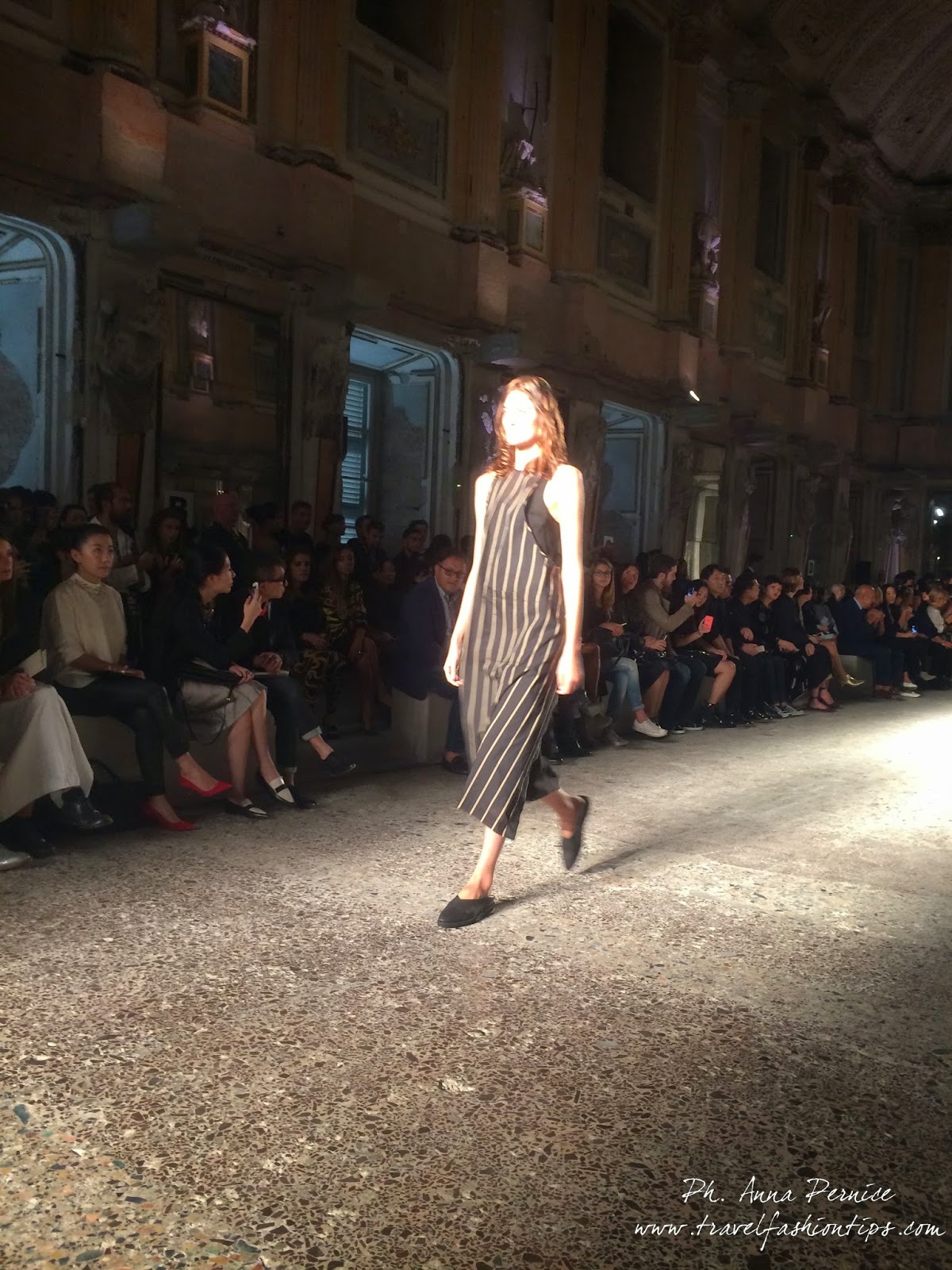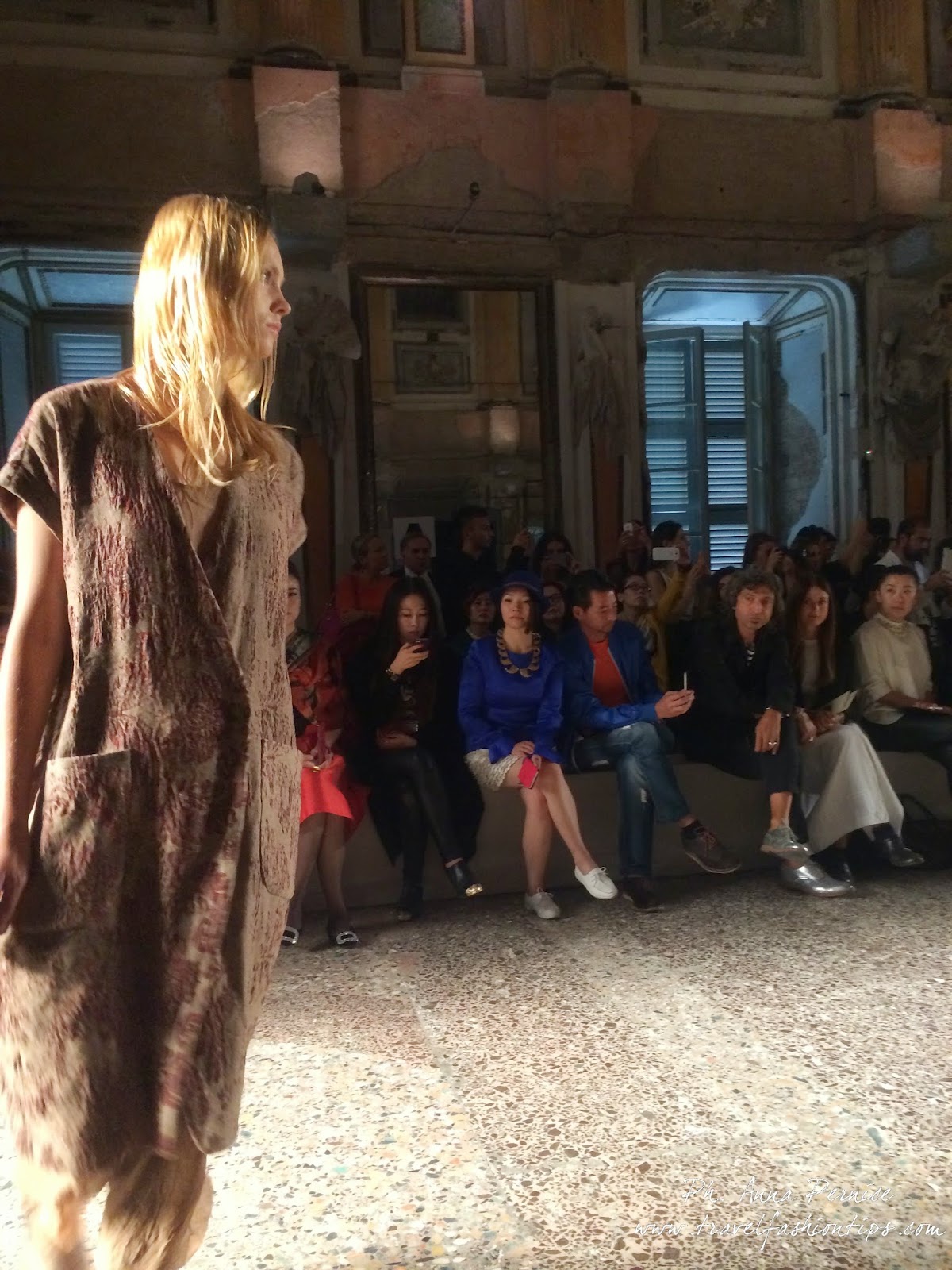 Gli abiti nascono dall’incontro tra pesante e leggero: tuniche dai volumi over e dai colori imperfetti, bordeaux, color carne e blu, pezzi maschili come le giacche in jacquard, completi simil pijama in seta e ampi vestiti multirighe. Ogni capo è diverso dall’altro, ed evoca allo stesso tempo oriente e occidente, a svelare ancora la doppia anima della stilista.