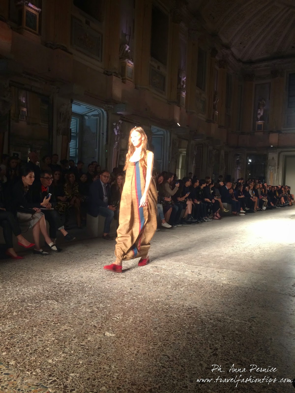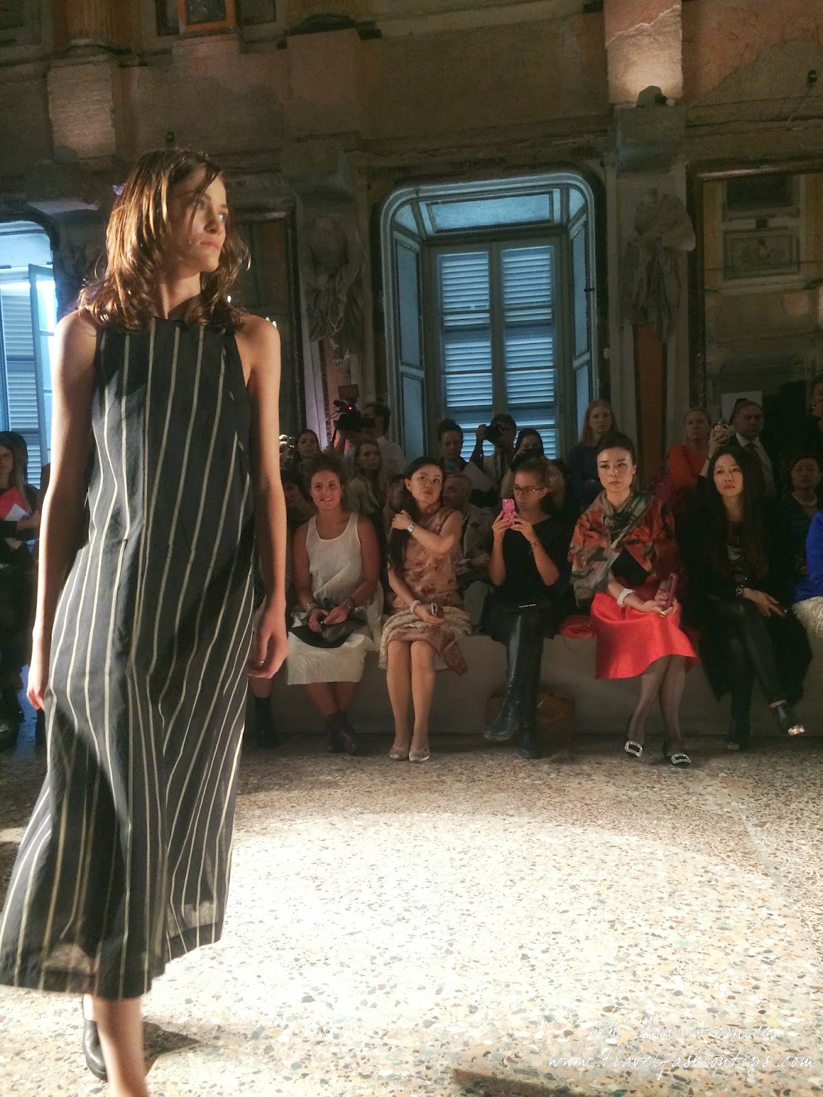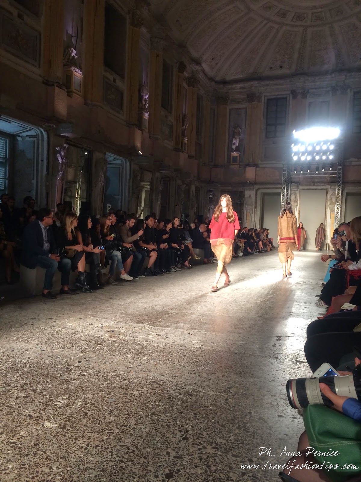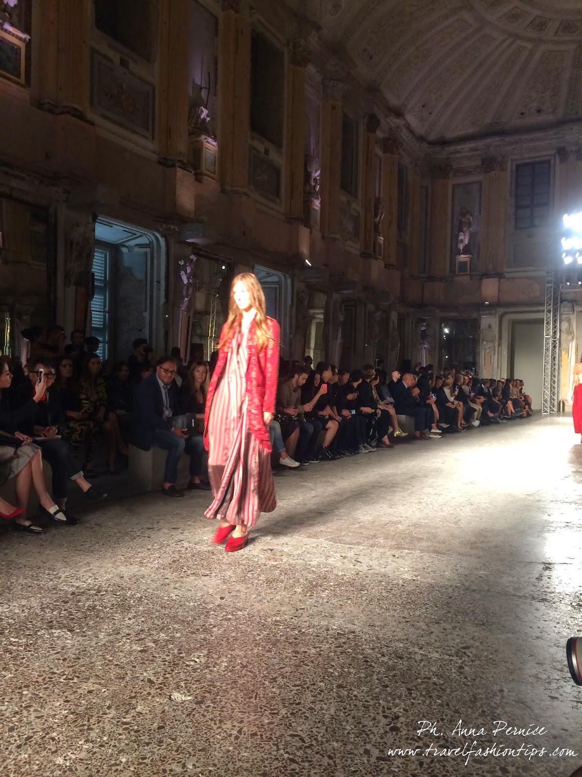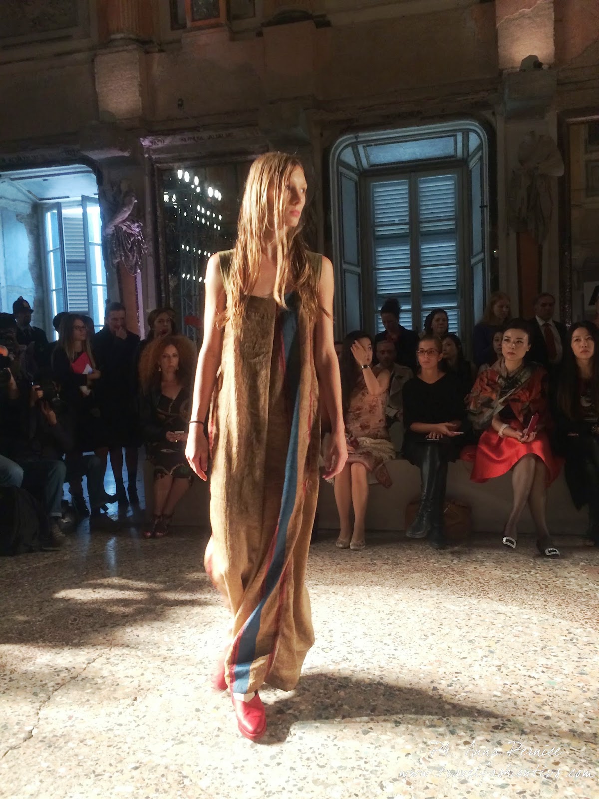 Gli abiti nascono dall’incontro tra pesante e leggero: tuniche dai volumi over e dai colori imperfetti, bordeaux, color carne e blu, pezzi maschili come le giacche in jacquard, completi simil pijama in seta e ampi vestiti multirighe. Ogni capo è diverso dall’altro, ed evoca allo stesso tempo oriente e occidente, a svelare ancora la doppia anima della stilista.