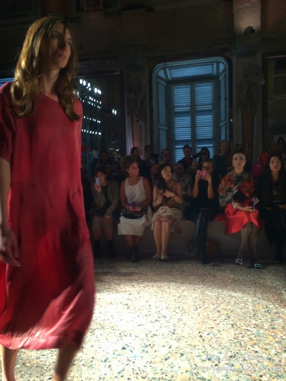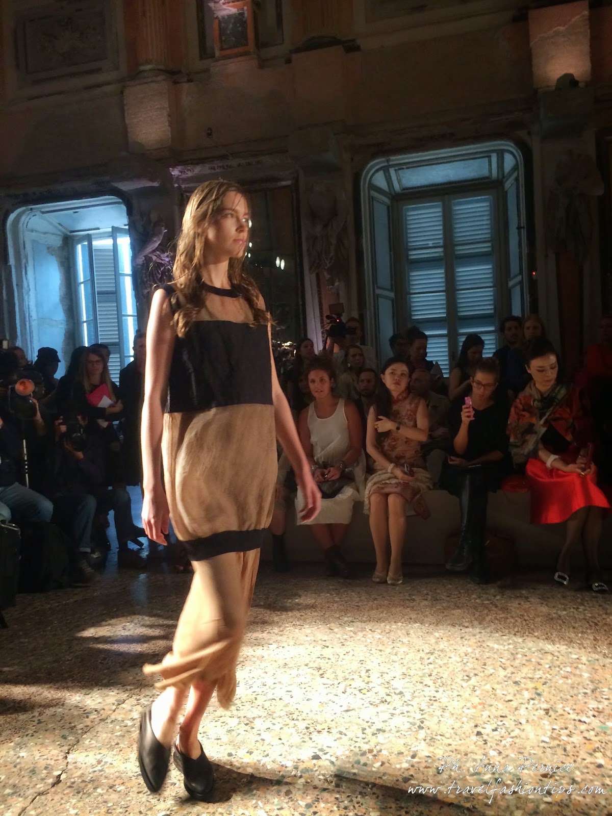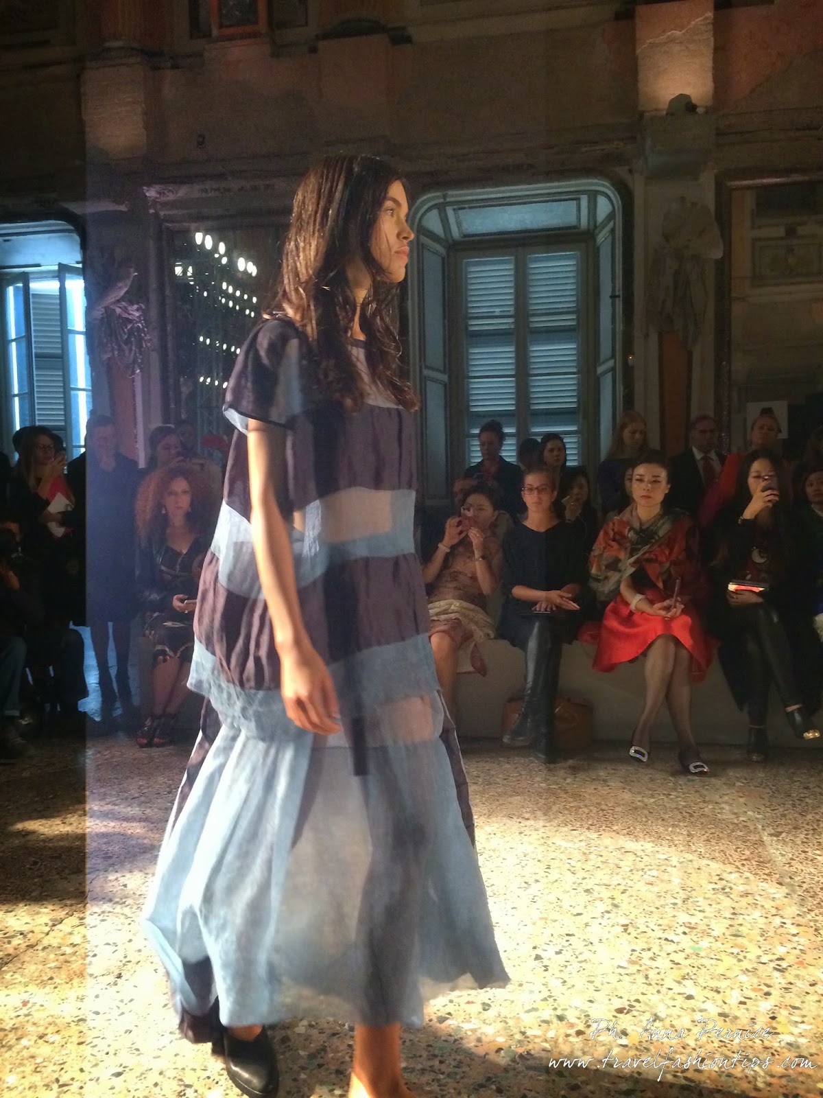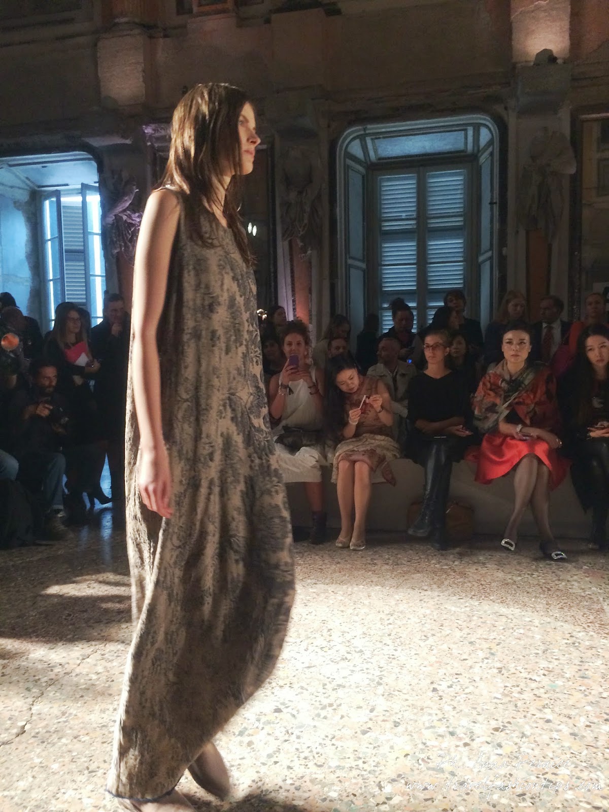 La sfilata della stilista di origini orientali, al terzo appuntamento con la passerella milanese, continua il suo viaggio sospeso tra la Cina, dove la designer è nata, e l’Italia, dove la stilista produce il 60% delle sue collezioni, a Mantova, con tessuti made in Italy.