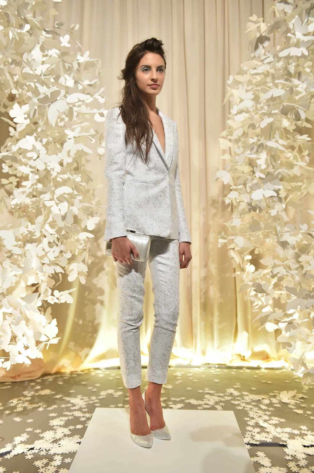 La head designer Frida Weyer ha scelto come protagonista per la collezione il bianco in tutte le sue varianti, dando vita a giochi di luce e ombra costruiti sull’assenza di colore. La sapiente combinazione di texture diverse in svariate tonalità di bianco, ha trasmesso un senso di nitida purezza. Seta pura e tulle si alternano a delicati pizzi e raffinate applicazioni. Motivi con ispirazione naturale arricchiti di perle conferiscono agli abiti della collezione quel sottile ma irresistibile tocco di seduzione. Abiti da sera, da cerimonia e da sposa si fondono nella massima femminilità delle linee alla più sensuale materialità, creando magicamente il 18 settembre una suggestiva installazione luminosa