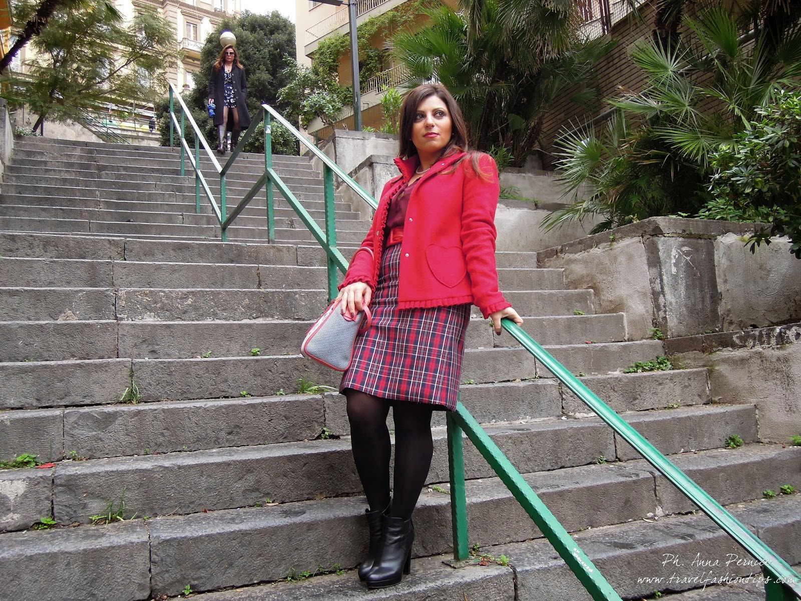 In questo periodo il rosso è il mio colore preferito. Mi piace indossarlo in quasi tutti gli accessori: borse, scarpe, giacche, camicie e persino gonne. Così, è stato proprio il rosso il tema del mio outfit per una conferenza stampa di sabato mattina. Per l’occasione ho indossato la mia nuovissima camicetta di chiffon bordeaux acquistata su trendyfine, abbinata alla gonna tartan blu e rossa acquistata l’anno scorso su FrontRow e la mia nuova giacca rossa Camomilla Italia.