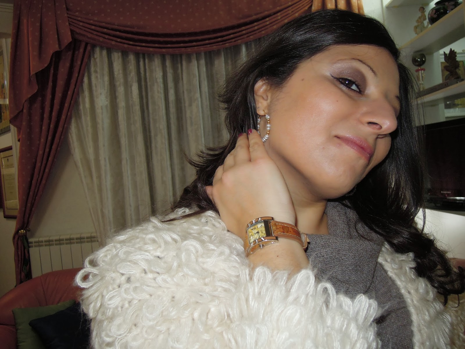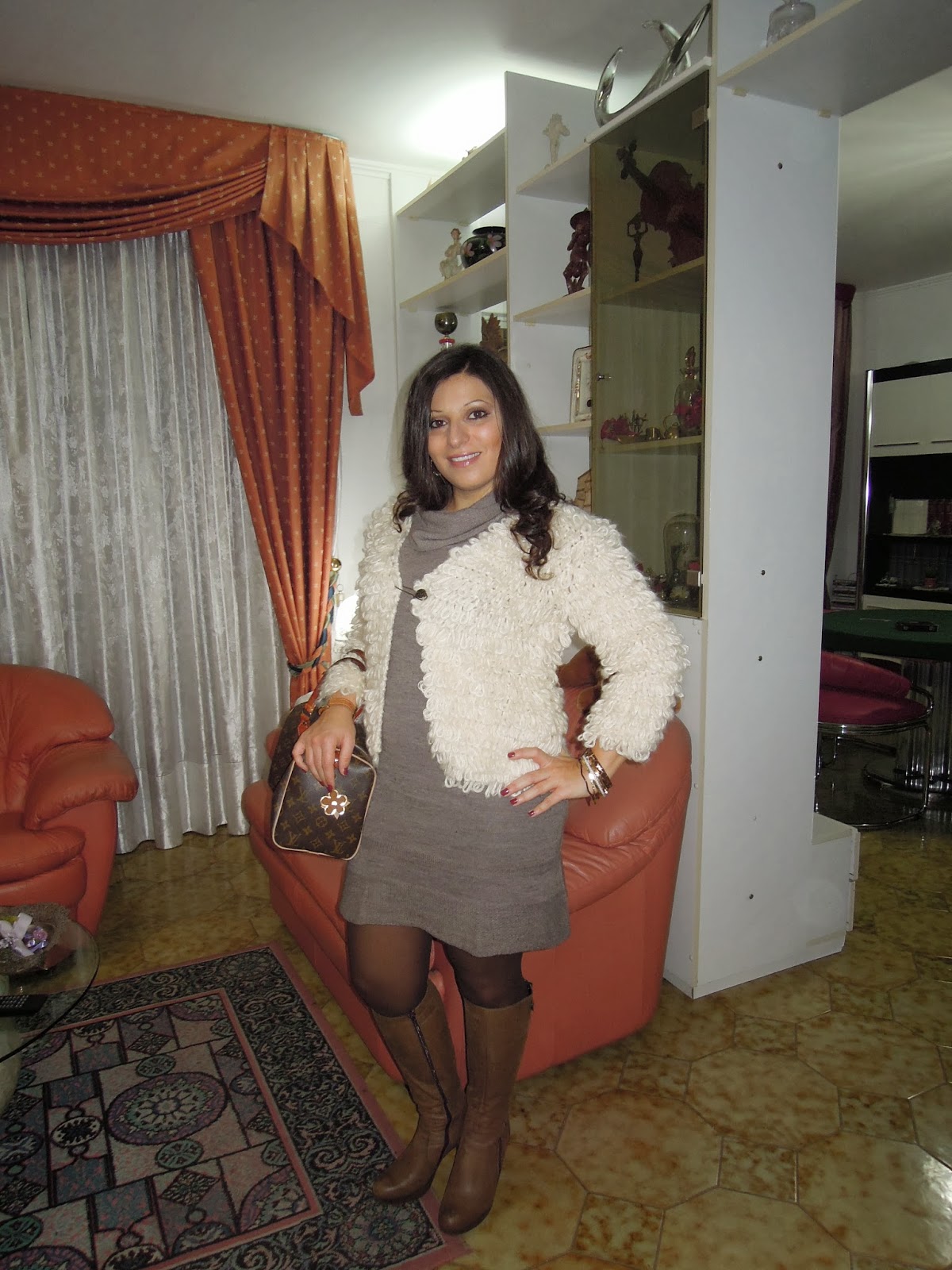 Ho deciso quindi per optare per un vestitino di lana a mezze maniche di Motivi da completare con un cardigan di pelliccia (sintetica) di Romwe. Calze color fumo e stivali con tacco ma con la gomma, per evitare scivoloni per strada. Anche gli accessori sono importanti, ho quindi optato er una spilla di bronzo per tenere chiusa la pelliccia, bauletto di allusi Vuitton, orologio Prima Classe ed orecchini di oro e perle a cerchio.