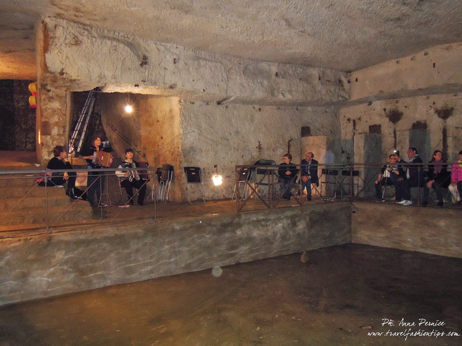 Molte auto purtroppo sono schiacciate perché negli anni ’50 il vecchio custode del tunnel, abusivamente, iniziò ad usarlo come discarica. Solo nel 2004 è iniziata l’opera di ripulitura dello stesso a cura di volontari che un po’ alla volta stanno riportando alla luce le bellezze della Napoli sotterranea. Ad oggi i percorsi praticabili del Tunnel Borbonico sono 3 e prevedono anche delle attività divertenti di climbing, rafting e speleo. A breve sarà aperto un quarto percorso, che ho avuto l’onore di vedere in anteprima grazie al Gran Tour della Campania e ArteCard e fermarmi in un’antica cisterna del ‘600, situata sotto palazzo Serra di Cassano, che è stata anche il rifugio del presidente Napolitano. Li, in perfetto stile Gran Tour, ci hanno fatto accomodare su delle sedie tutte intorno alla cisterna ed ascoltare “Caruso in marcia”, concerto ad opera di Cristina Vetrone e Eduarda Iscaro con una carrellata di canti ispirati alla grande guerra, marcette e brani strumentali con organetto e fisarmonica, sugli eventi bellici che si svolgevano in Europa, quando Caruso già viveva in America. Da Over There (George M. Choen, 1918) a Liberty Forever, (1918) eseguita ed incisa dalla Victor Military Band, una carrellata di pezzi ispirati alla I Guerra Mondiale..