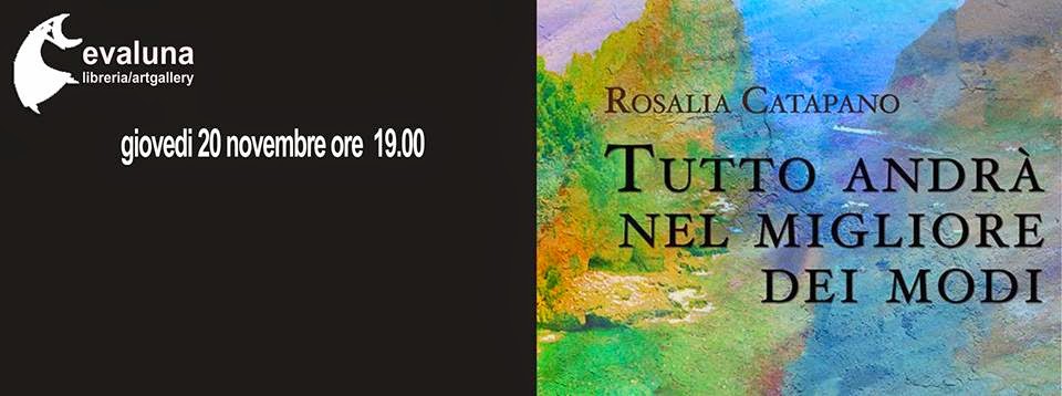 Giovedi 20 novembre presso la libreria artgallery Evaluna in Piazza Bellini, 72 Napoli sarà presentato il nuovo romanzo di Rosalia Catapano “Tutto andrà nel migliore dei modi”, che svela il misterioso passato di Raùl Ortega, il giovane e inquieto stilista barcellonese protagonista di “SOLO NINA”, il primo romanzo della Catapano.Con l’autrice ne parleranno Francesca Gerla e Chiara Tortorelli. Letture a cura di Giuliana Gaudyer.