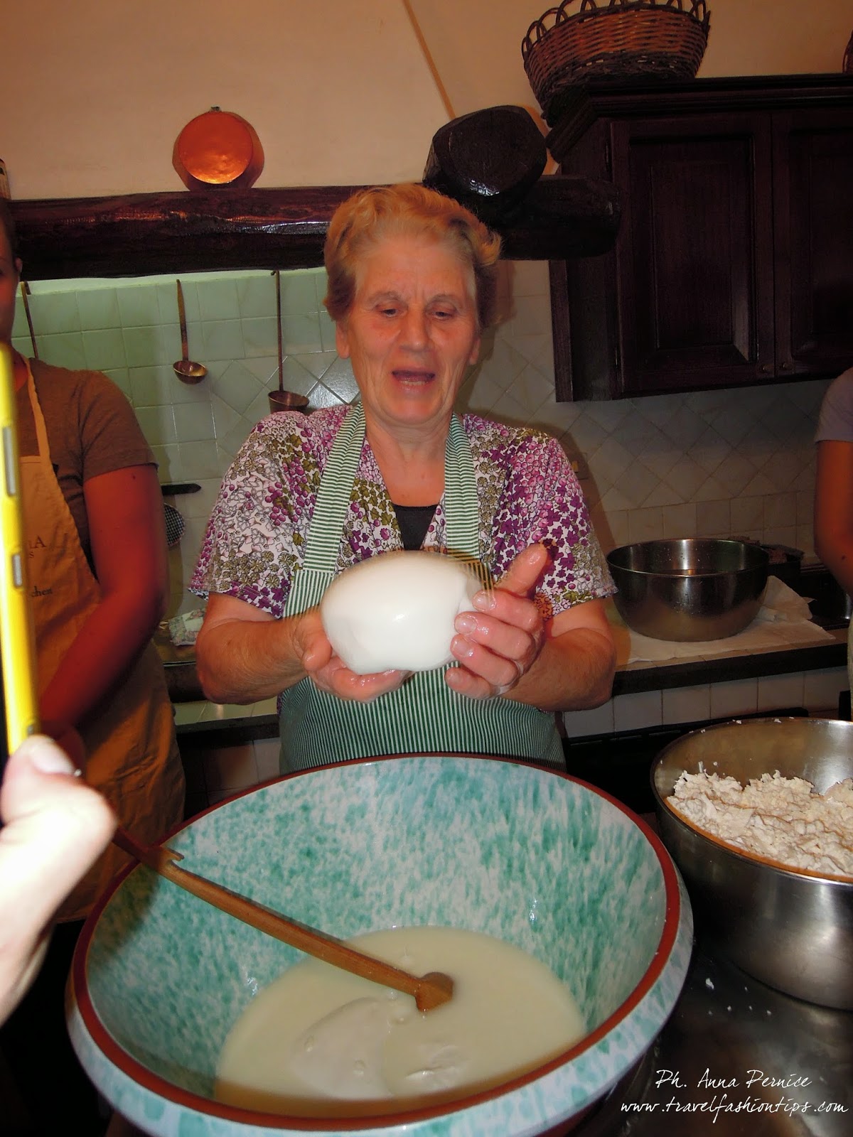 Abbiamo così visto come il formaggio, per diventare mozzarella, è stato tagliato e sminuzzato in pezzettini piccoli, la signora Rosa e le sue nipoti hanno poi aggiunto acqua calda ed hanno iniziato a mescolare fino a quando il formaggio non ha iniziato a filare. A quel punto, é stato modellato nelle forme desiderate.