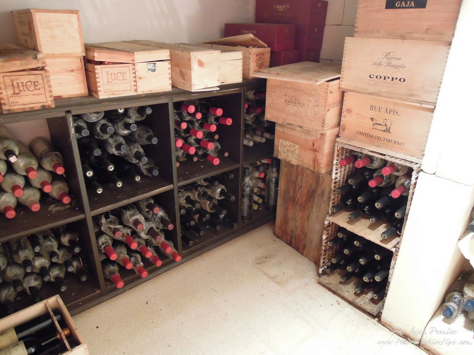 Dopo l’aperitivo visita della tenuta, rispettivamente il bellissimo tramonto dalla piscina, il panorama dal terrazzo sui due golfi, davvero mozzafiato, Capri è ad un tiro di schioppo, poi all’orticello, ricco di pomodori, peperoni e zucchine ed infine alla cantina, molto caratteristica, dove tra un attrezzo antico e una botte, ricoperte di polvere invecchiano ottime etichette di vini locali e non.